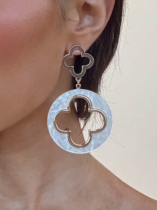The Keels Earrings are a gold clover shaped drop earring with pearl detailing.