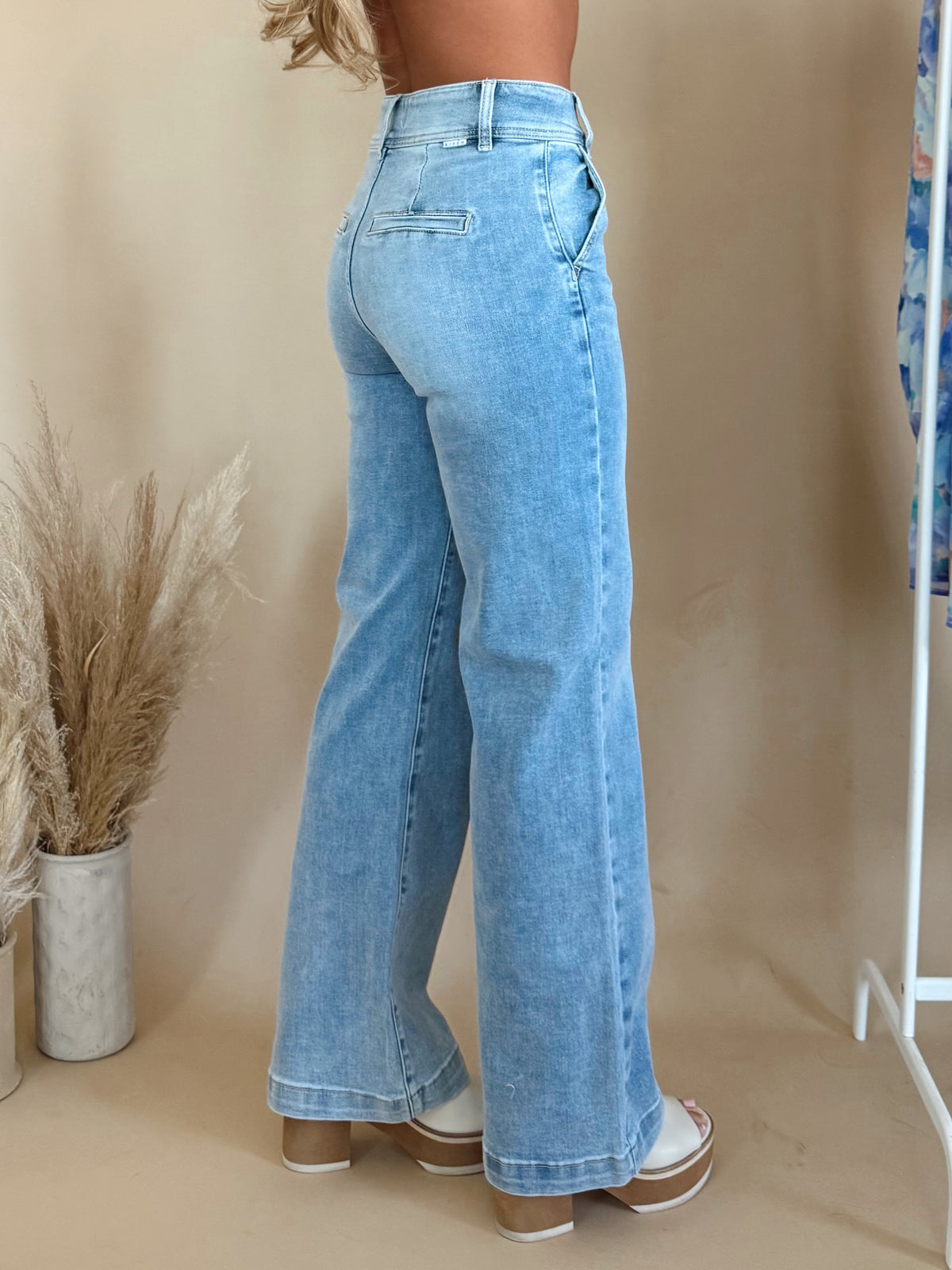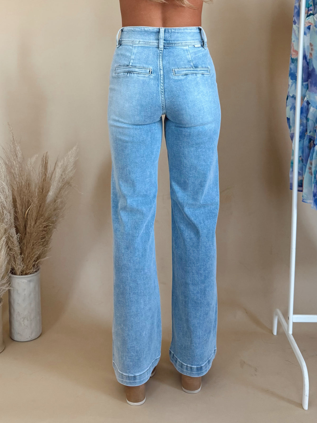 Our Darby Jean is a high waisted denim featuring double buttons and a wide leg.