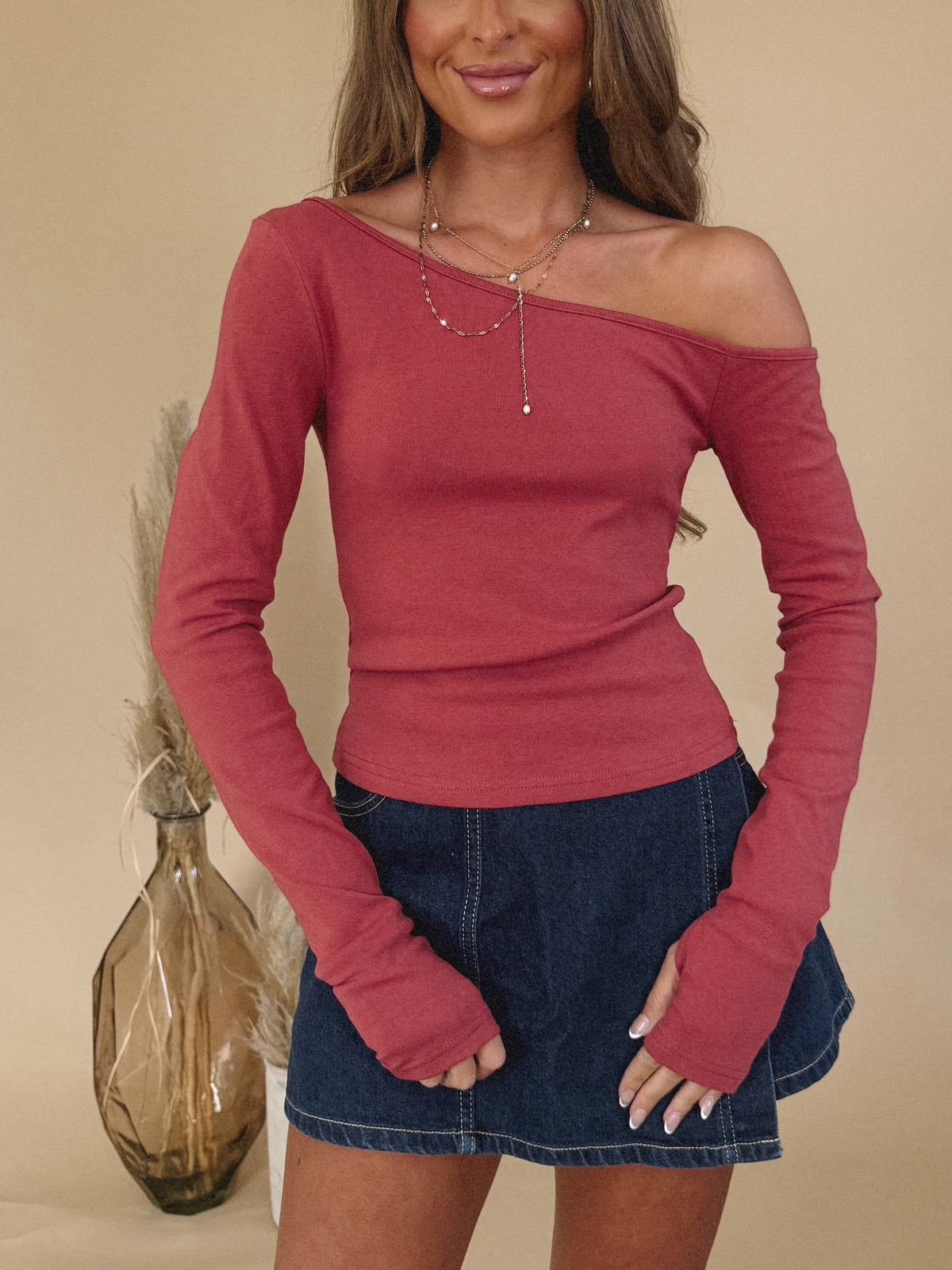 The Ellie Top is a coral long sleeve fitted top with a one shoulder detail.