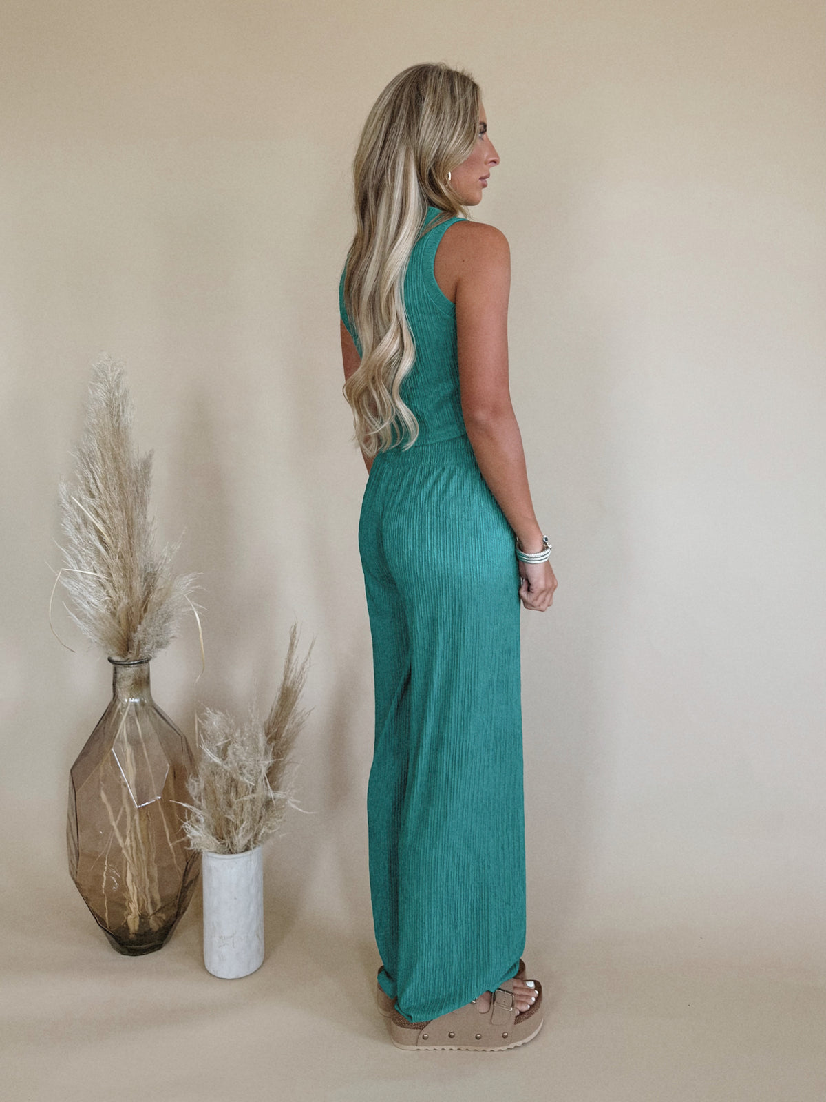 The Kellyn Set is a crinkled textured sleeveless cropped top loungewear set that can be worn dressed up or down.