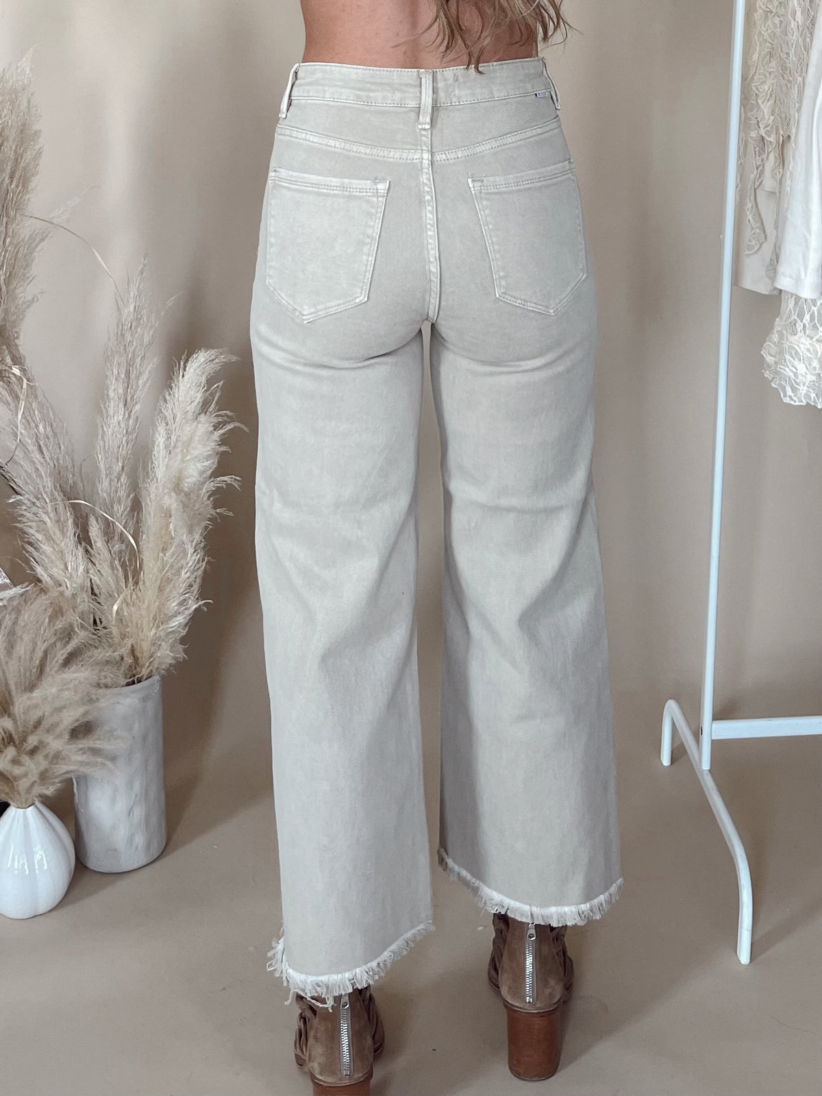 The Khaki Jean is a crop flare jean with a frayed bottom. They are the perfect color for fall.