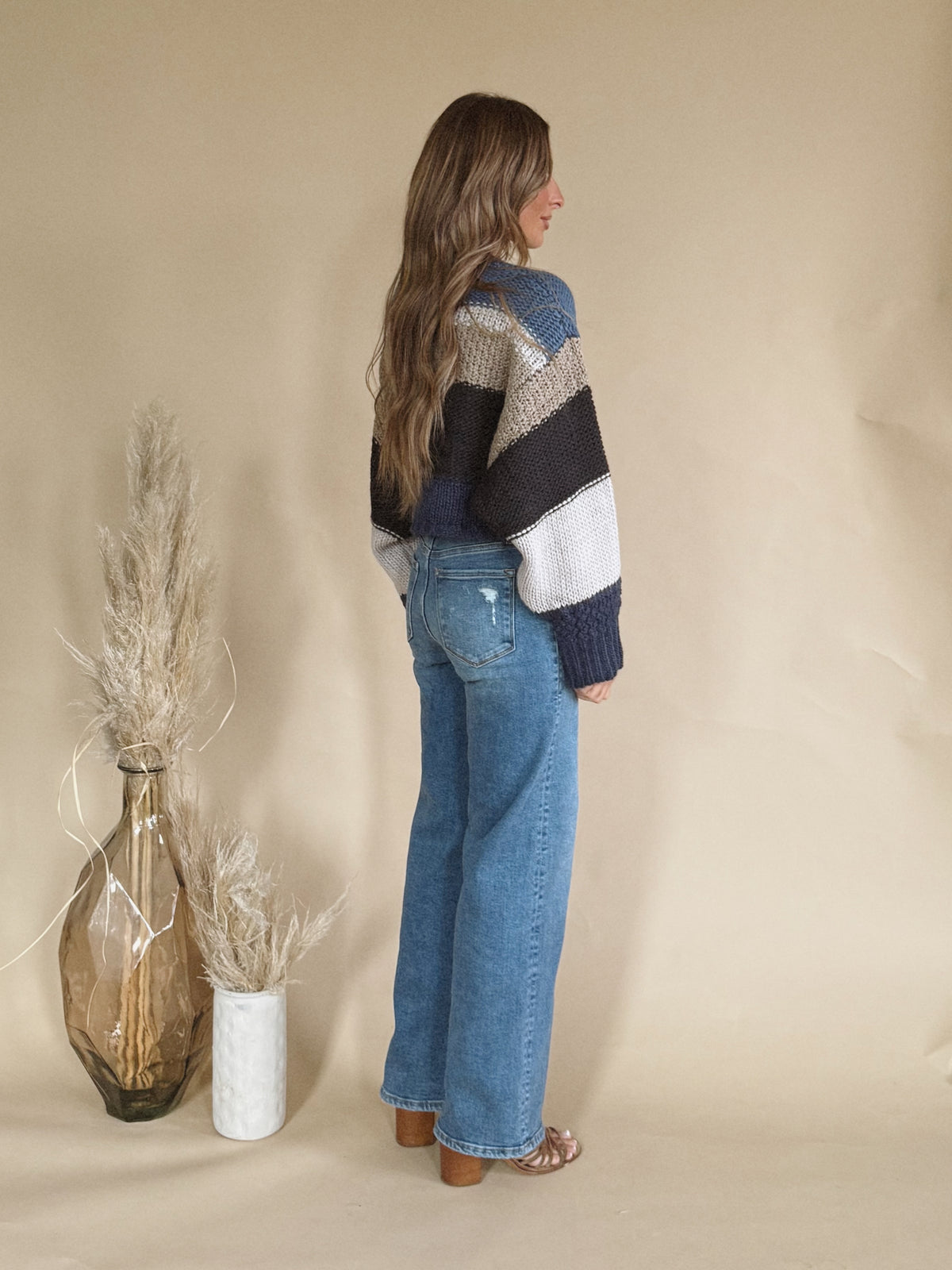 The Merritt Top is a navy multi colored cropped sweater.
