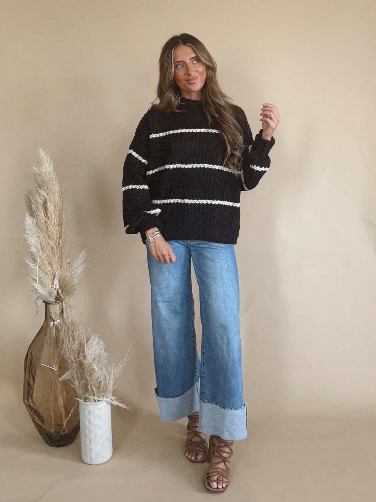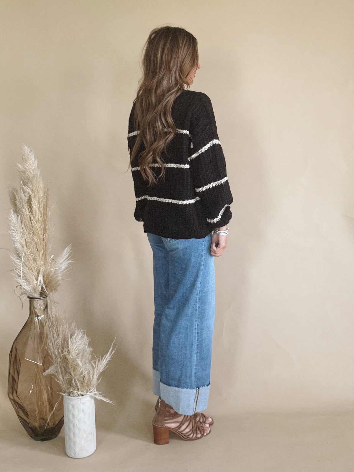 The Michelle Top is a oversized, knit sweater with stripe detailing.
