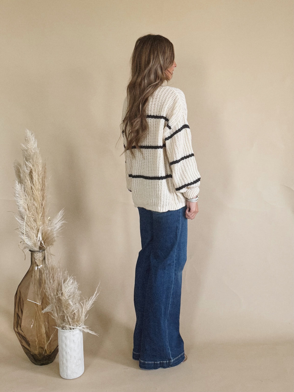 The Michelle Top is a oversized, knit sweater with stripe detailing.
