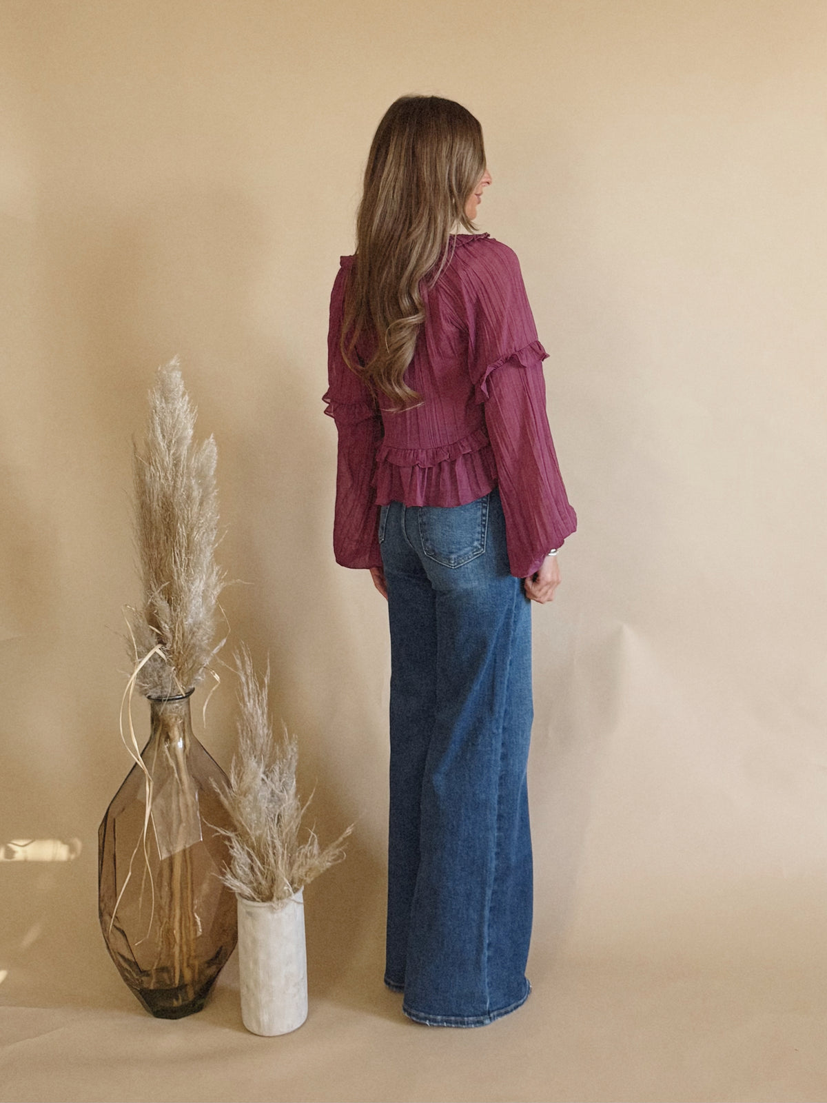 The Mila Top is a flowy, sheer, plum colored top with ruffle and tie detailing.