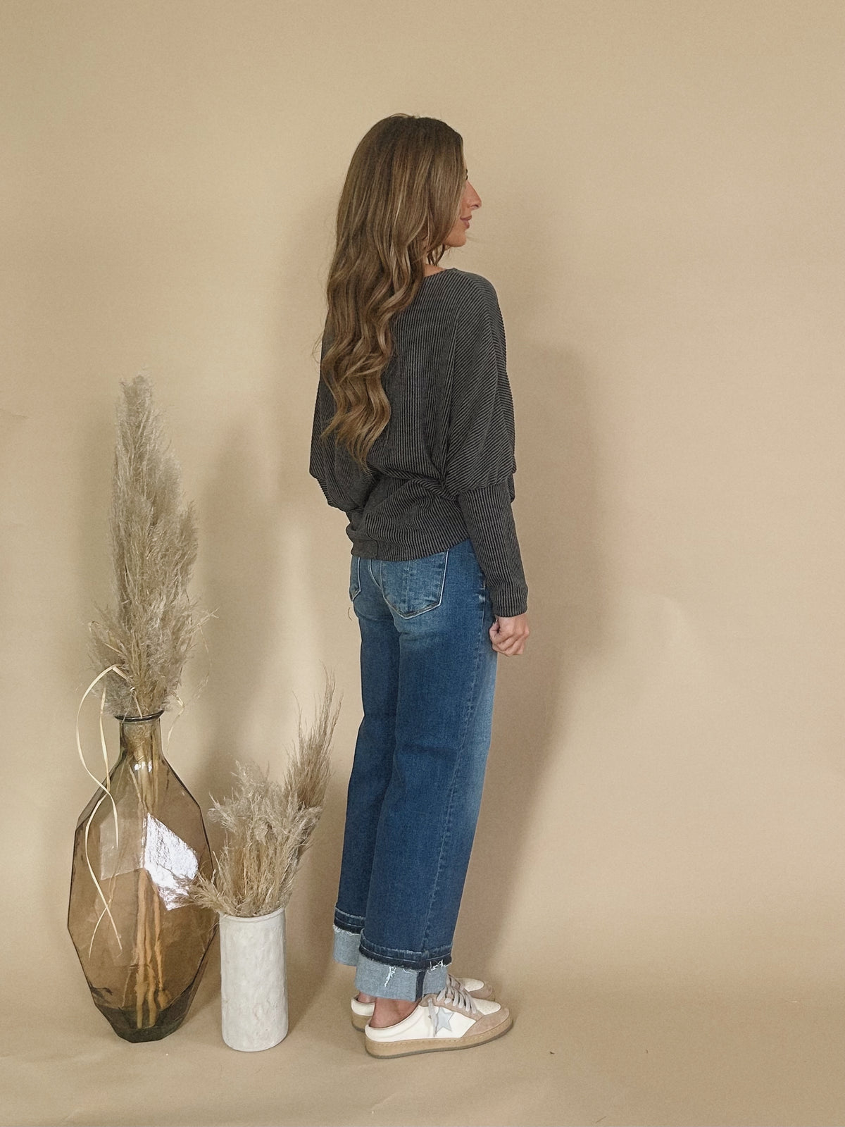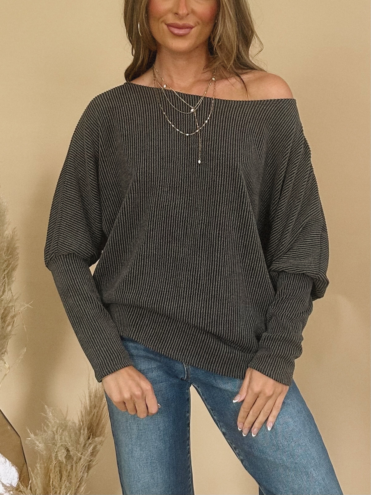 The Molly Top is a ribbed long sleeve top with a slouchy fit and can be worn off of one shoulder.