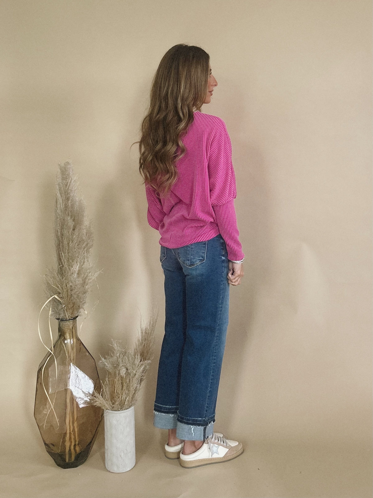 The Molly Top is a ribbed long sleeve top with a slouchy fit and can be worn off of one shoulder.