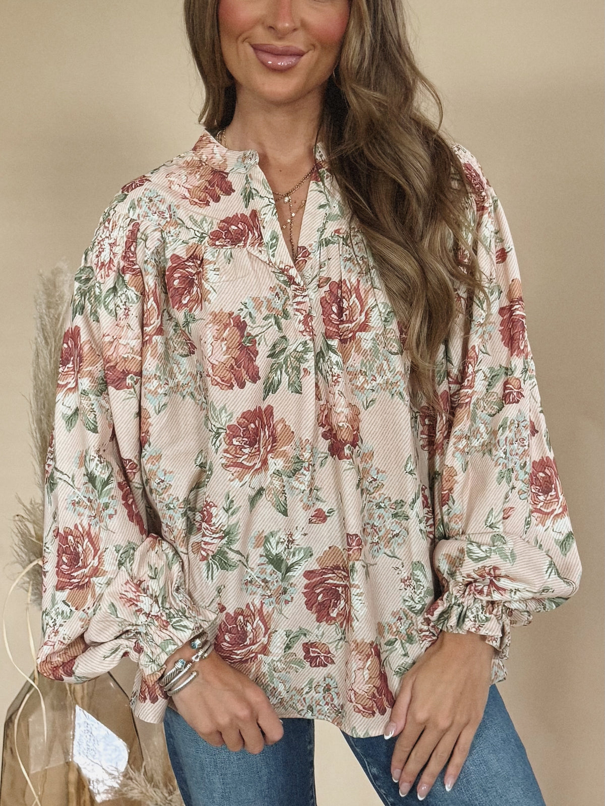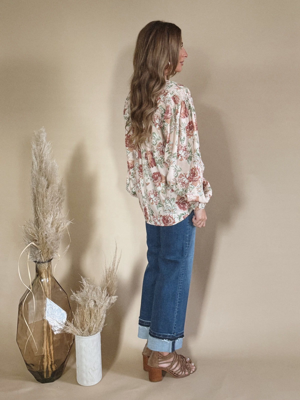 The Nancy Top is a fall colored floral top with a v-neck detail.