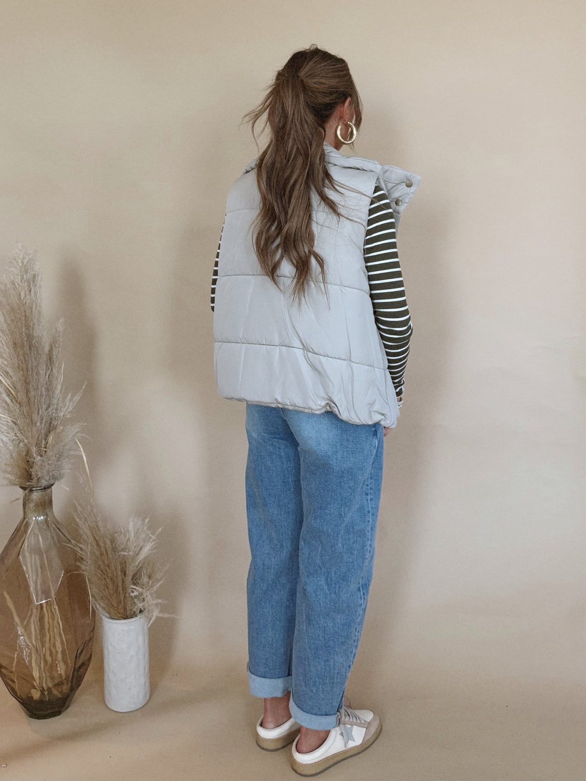 The Remi Vest is an oversized puffer vest with drawstring and button detail.