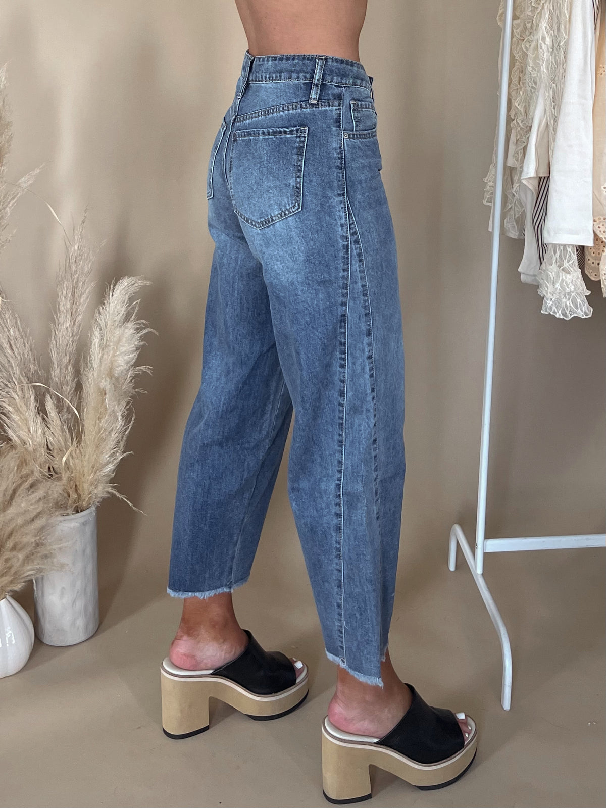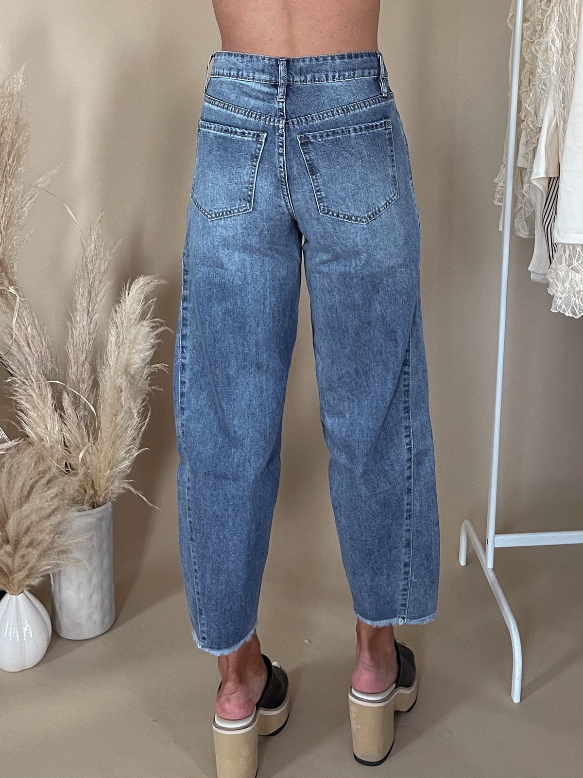 The Trina Jeans are a cropped, medium wash, barrel leg jean.