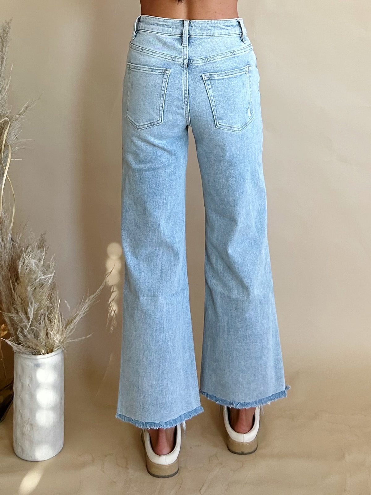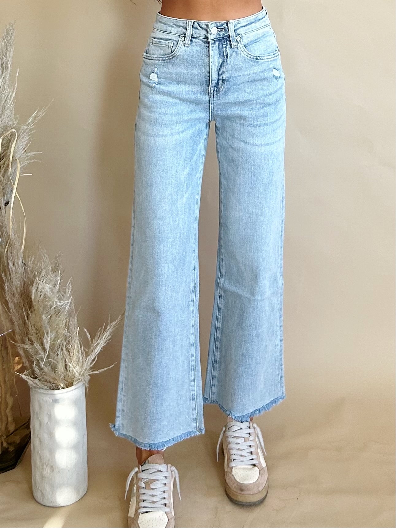The Cameron Jean is a light wash, high rise, wide legged cropped jean.