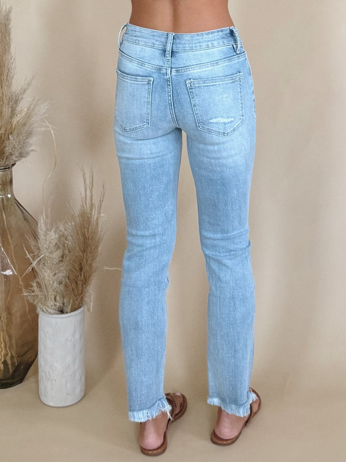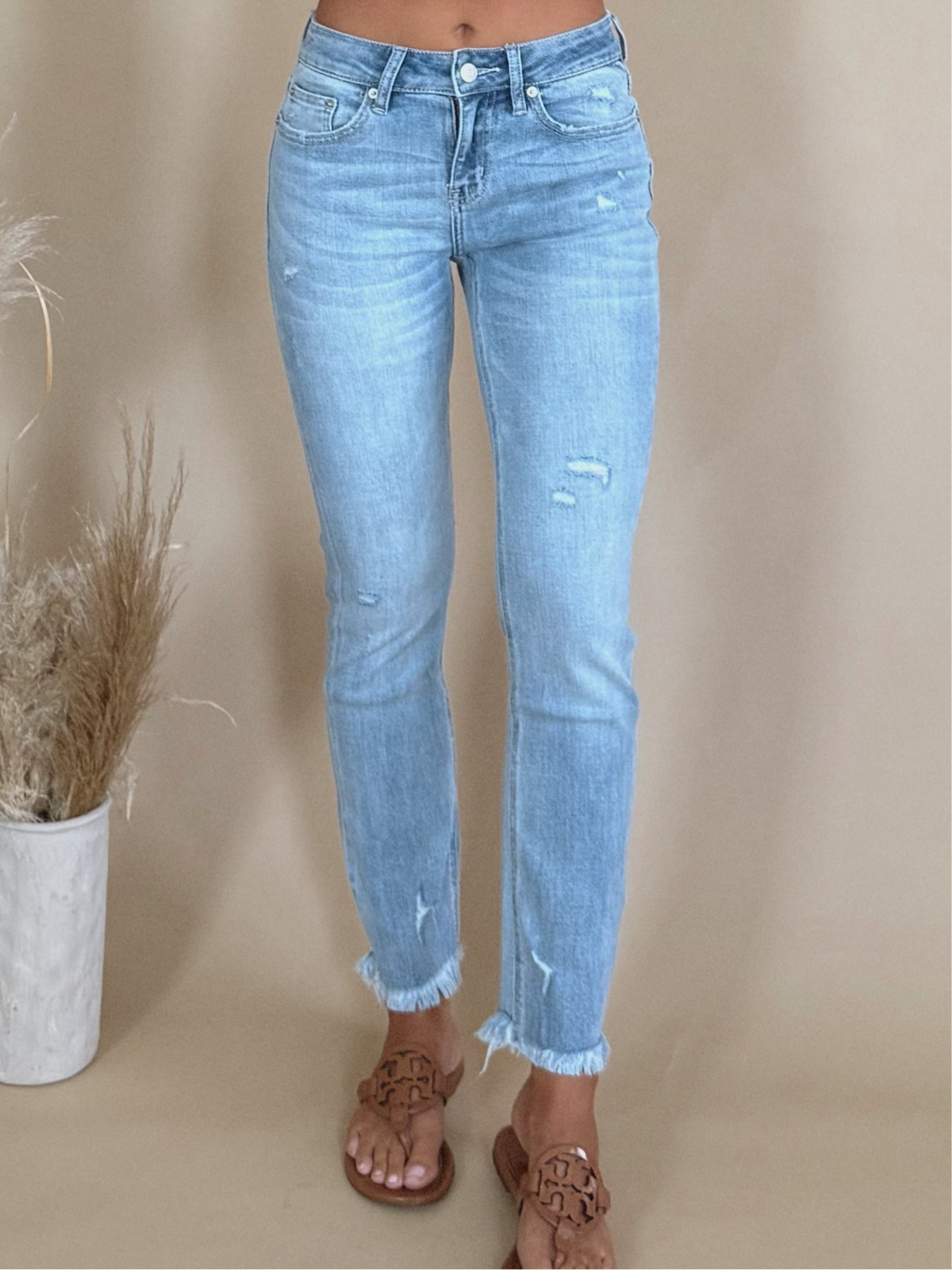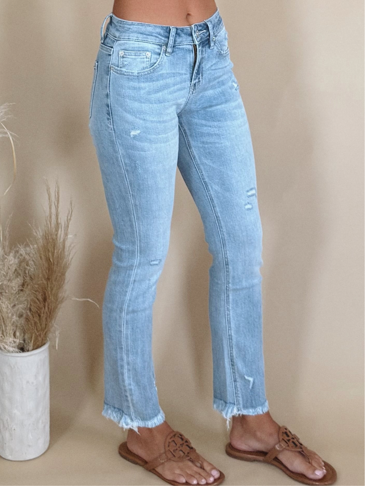 The Dana Jeans are a low rise, medium wash jean with a crop fit and slight distress.