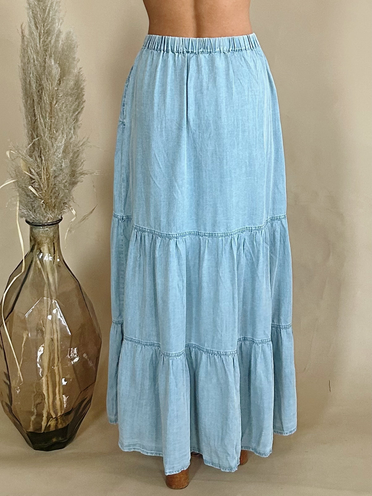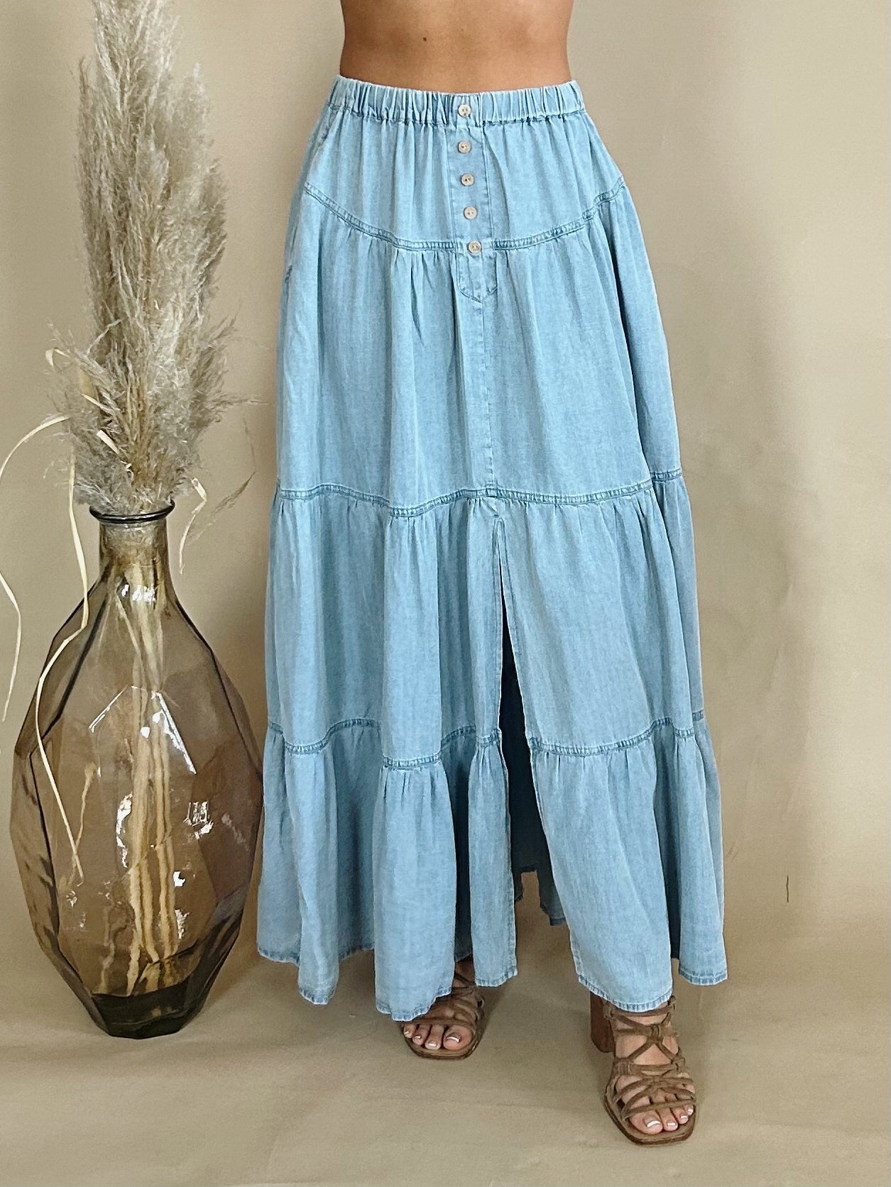 The Dina Skirt is a light wash denim chambray skirt with button down closure and a slit detail, it has an elastic waist.