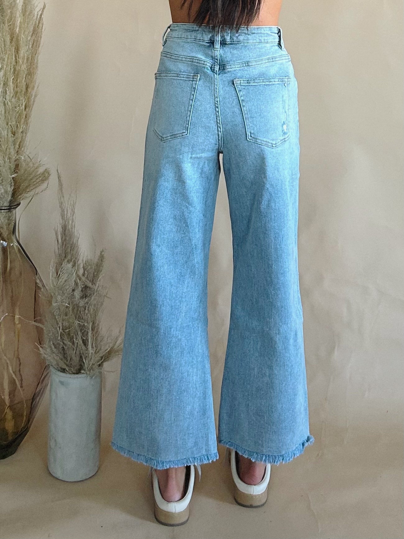 The Dixie Jean is a light wash, high rise, wide legged cropped jean.