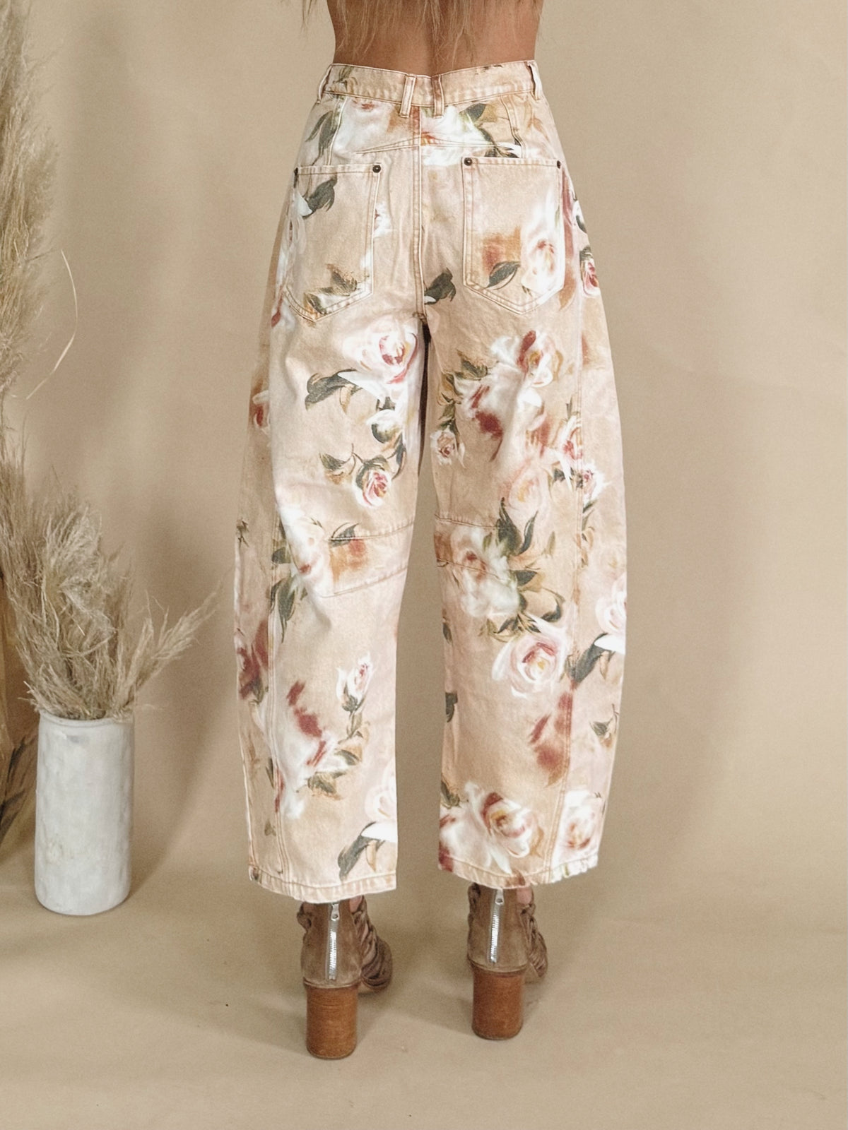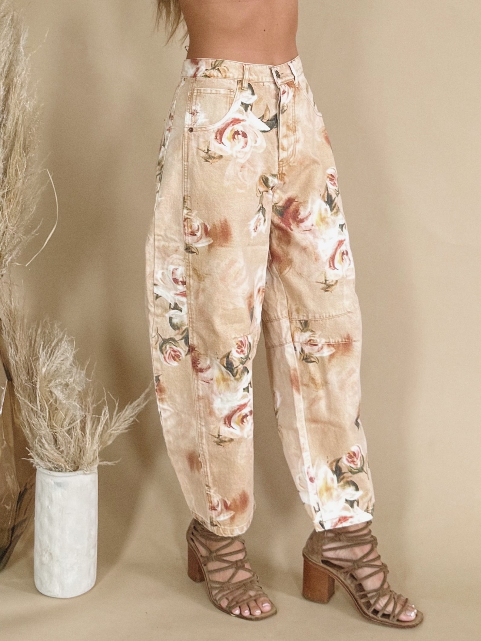 The Eulissa Pants are a low rise, barrel leg jean with a watercolor floral print.