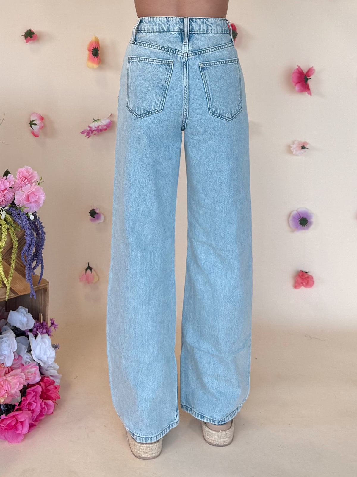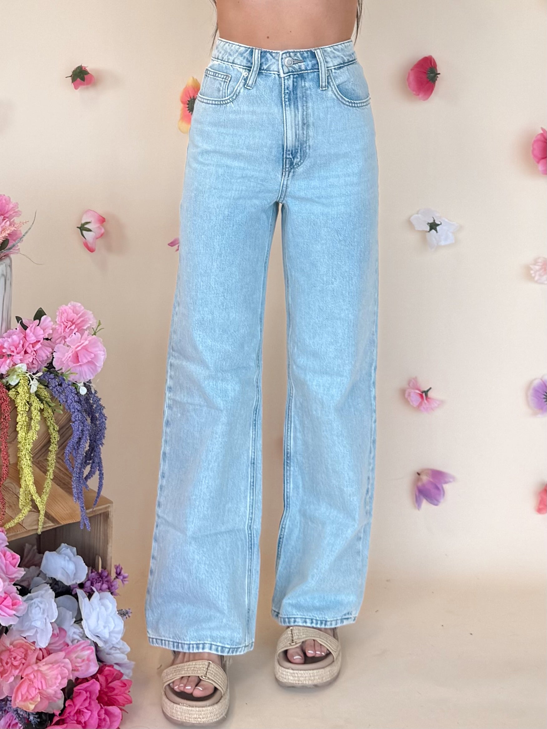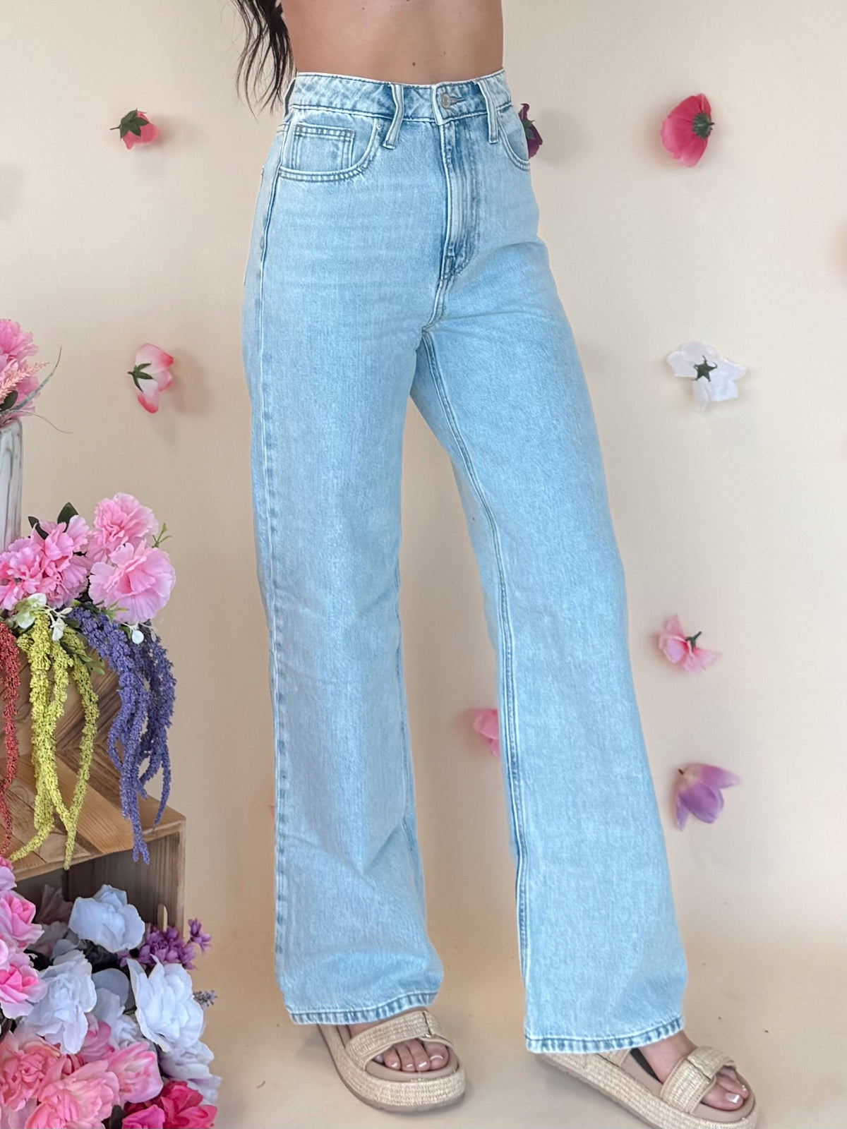 The Ginny Jeans are a light wash, high waisted, straight leg jean.