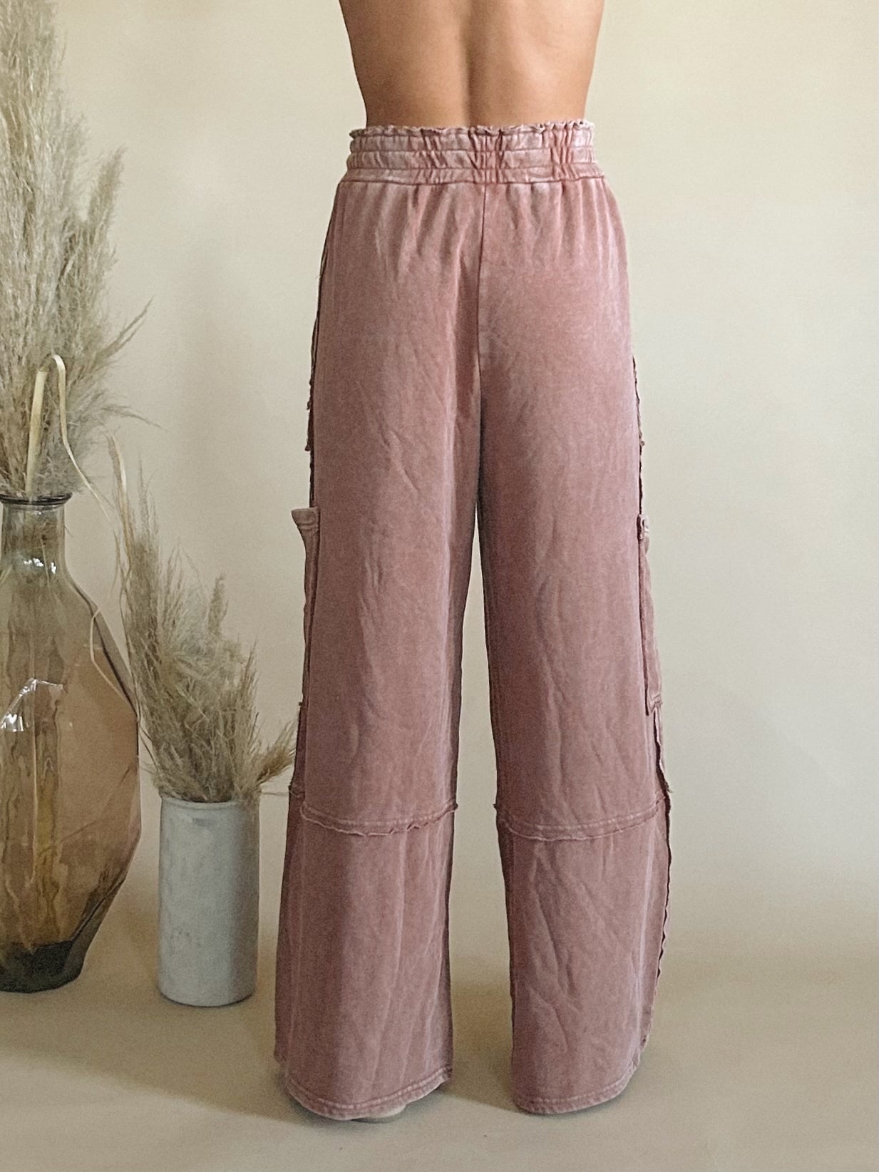 The Indie Pants are a rust colored sweatpants with pockets and seam details.