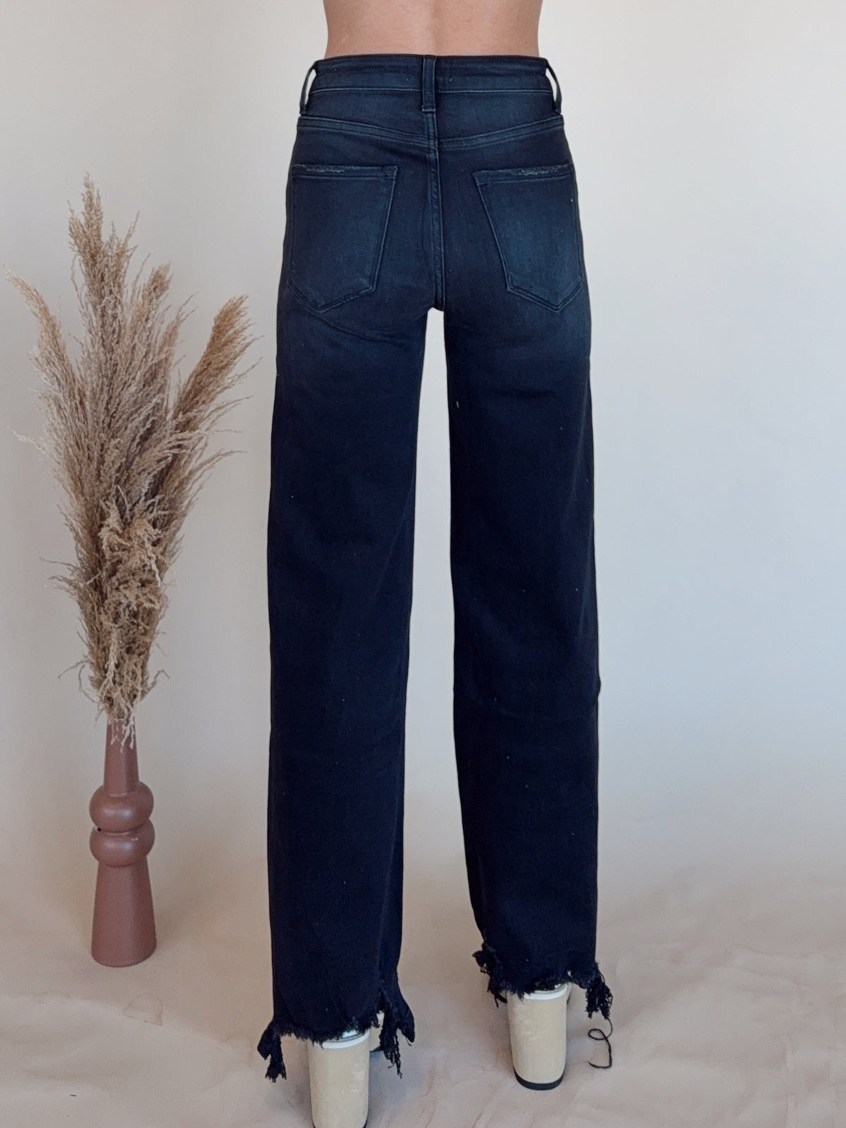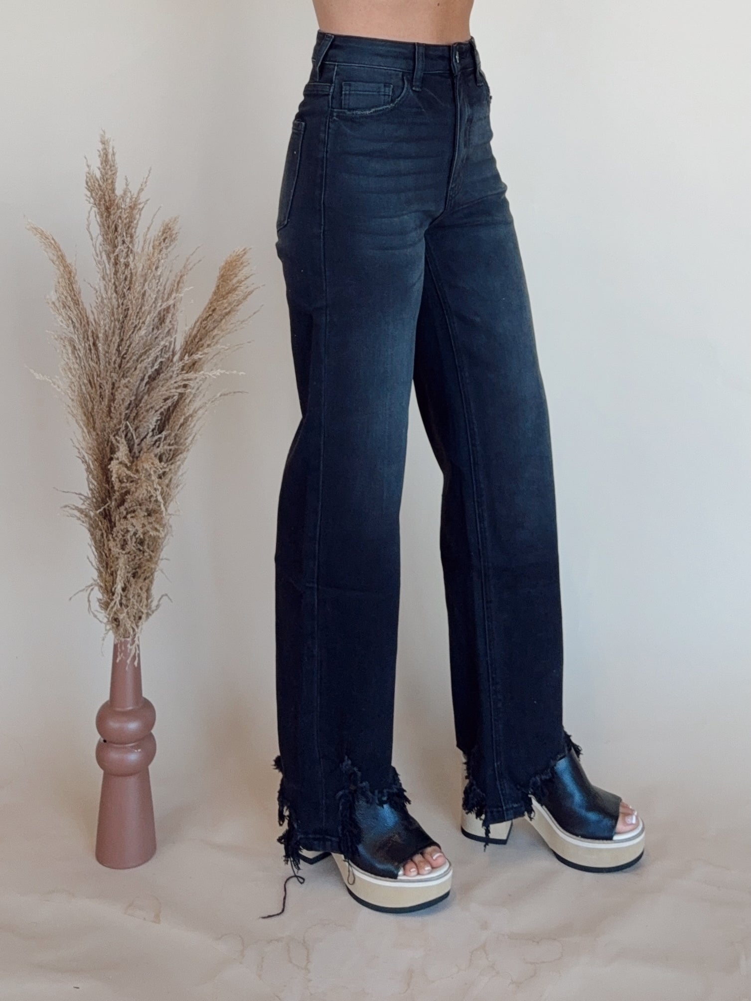 The Kameron Pants are a black wide leg jean with frayed detailing at the bottom.