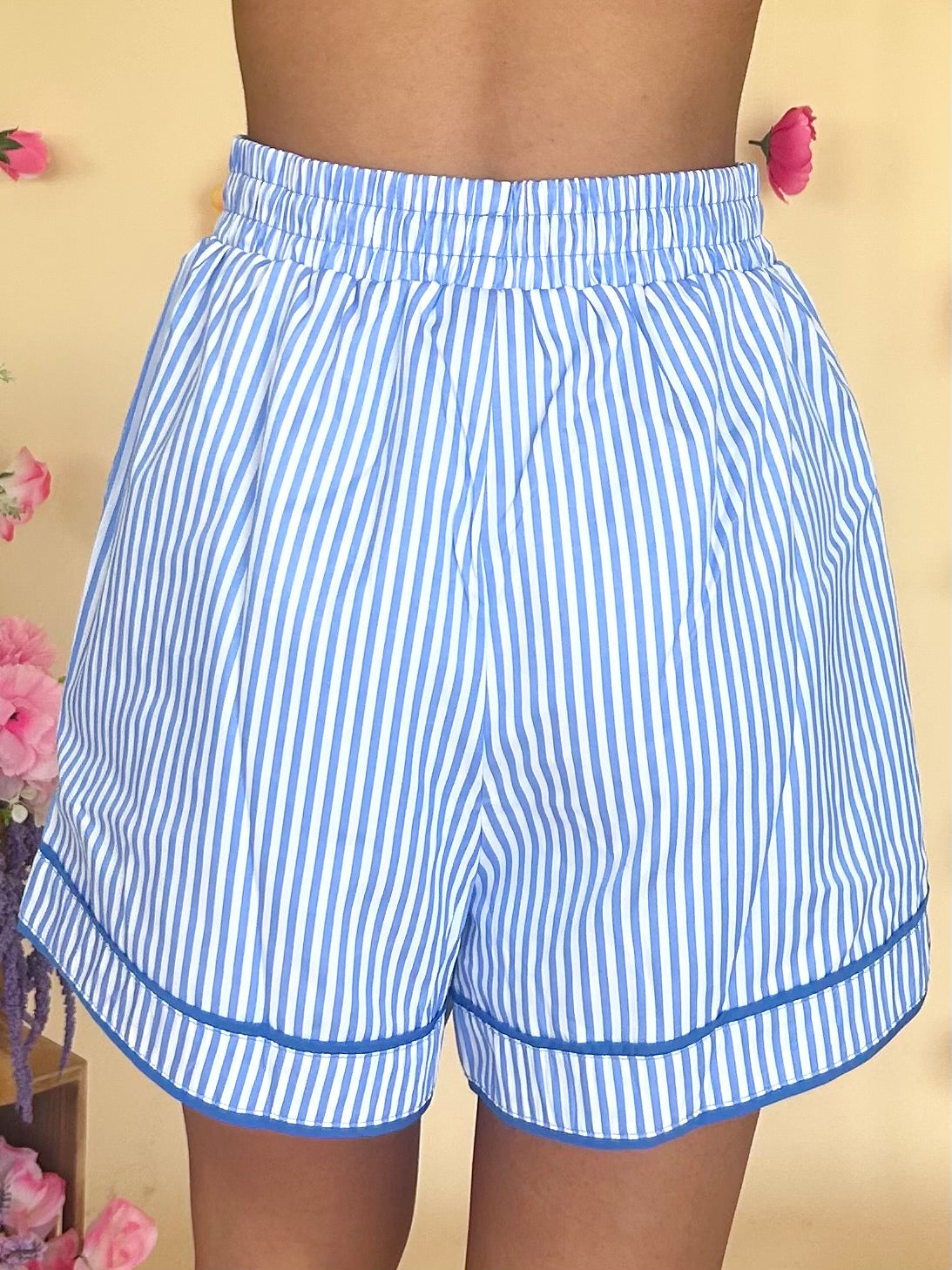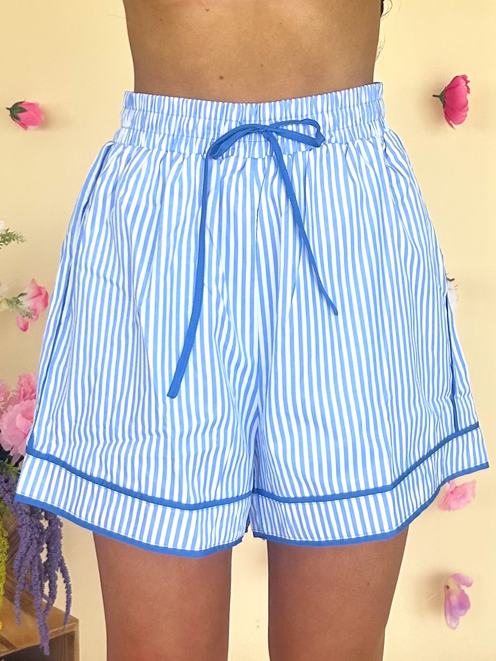 The Kellie Shorts are a striped longline short with an adjustable cinched waistband.