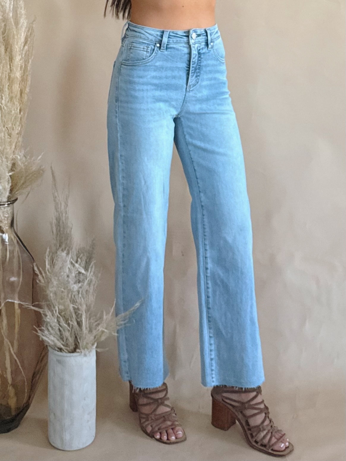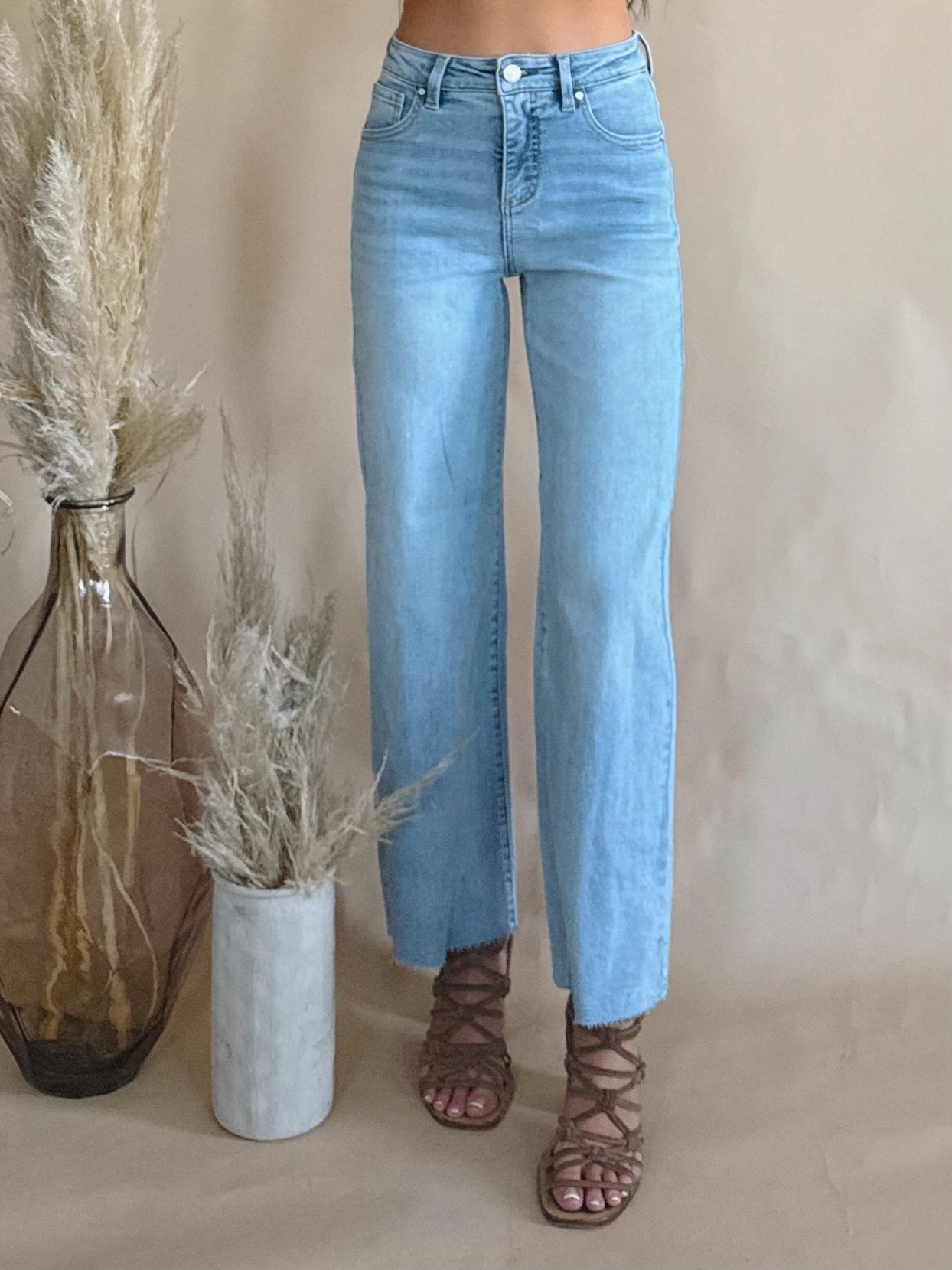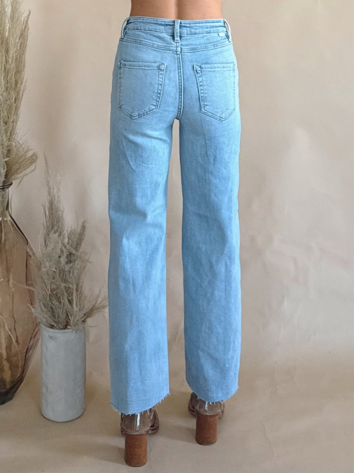 The Krista Jean is a light wash, high rise, cropped straight jean with a raw hem.