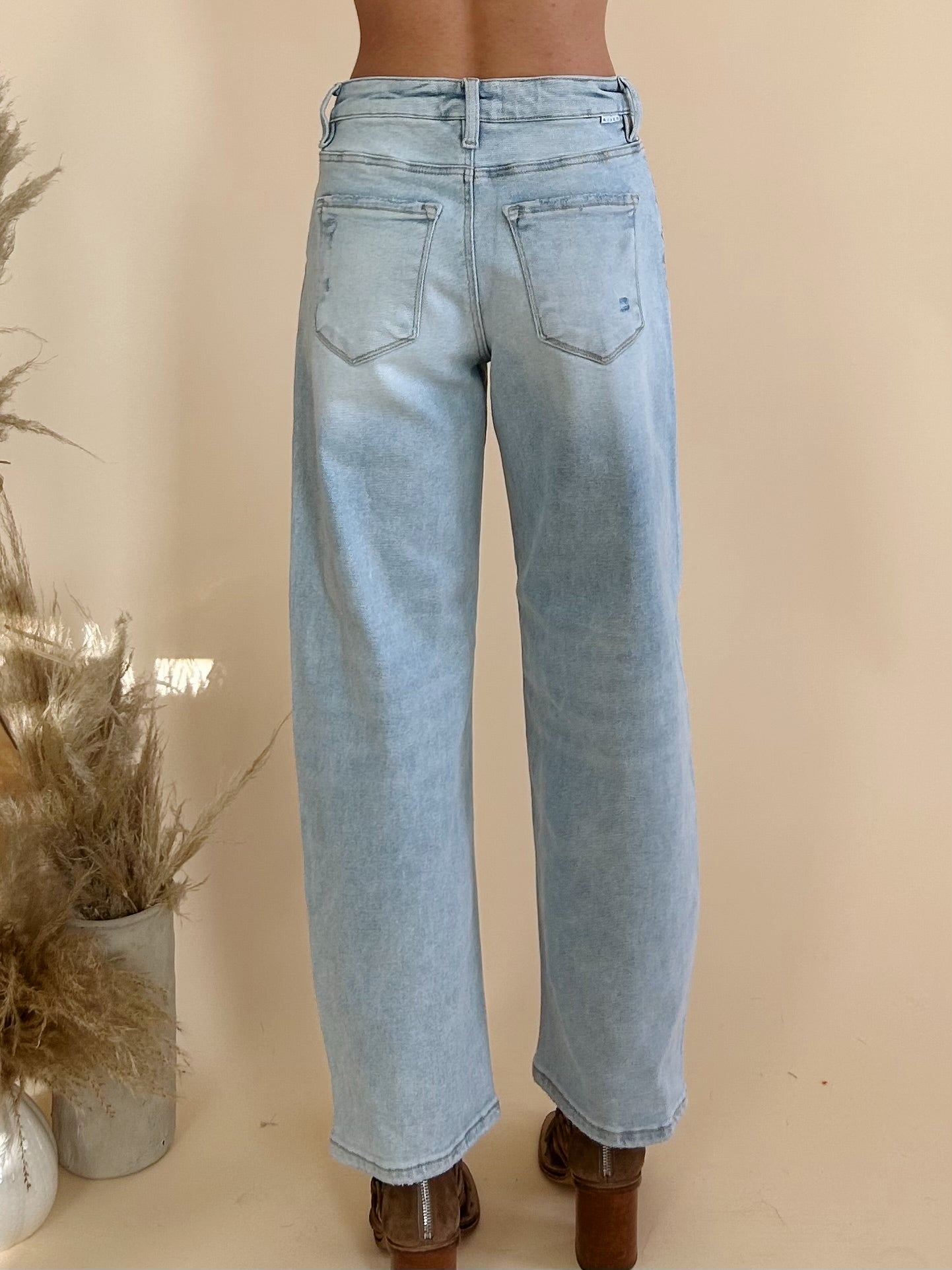 The Kylen Jeans are a light wash, barrel leg jean with a raw cut hem.