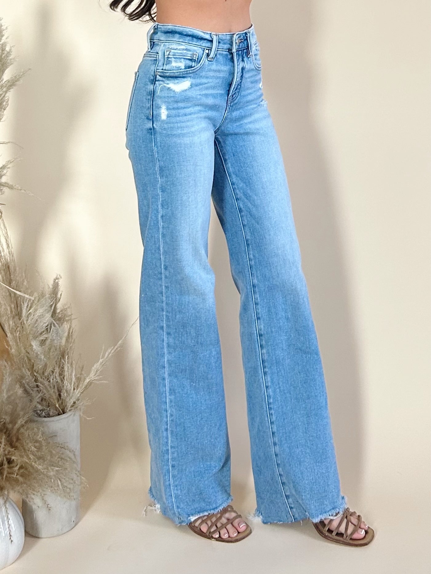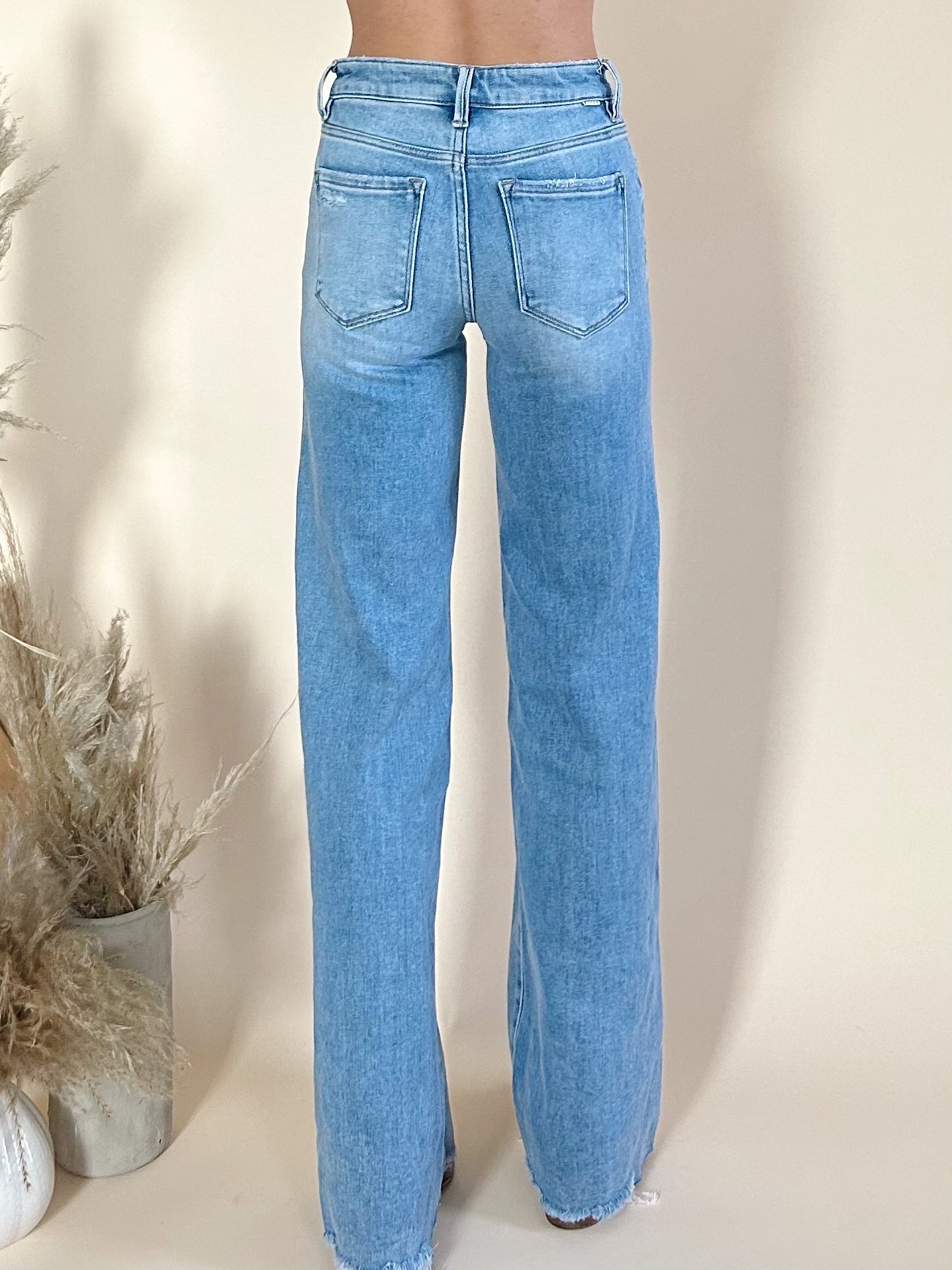 The Mal Jeans are a medium wash, straight leg jean with a raw cut hem.