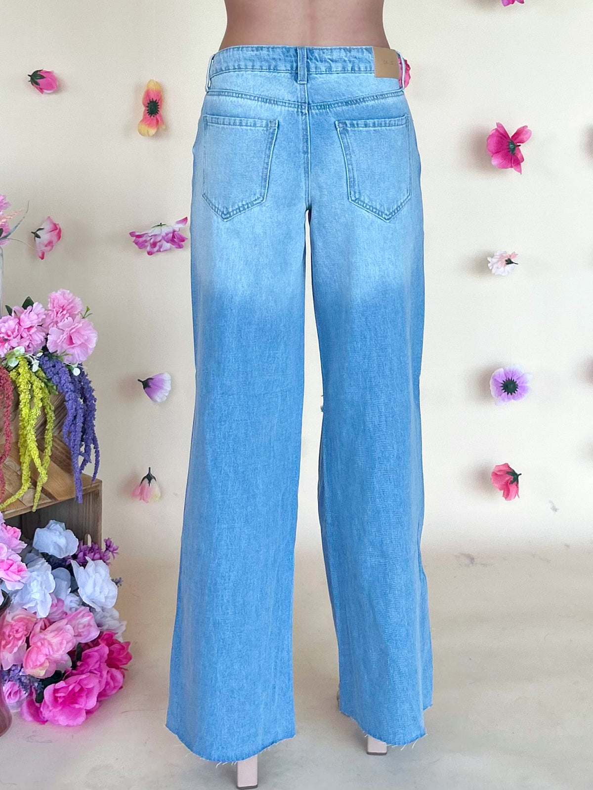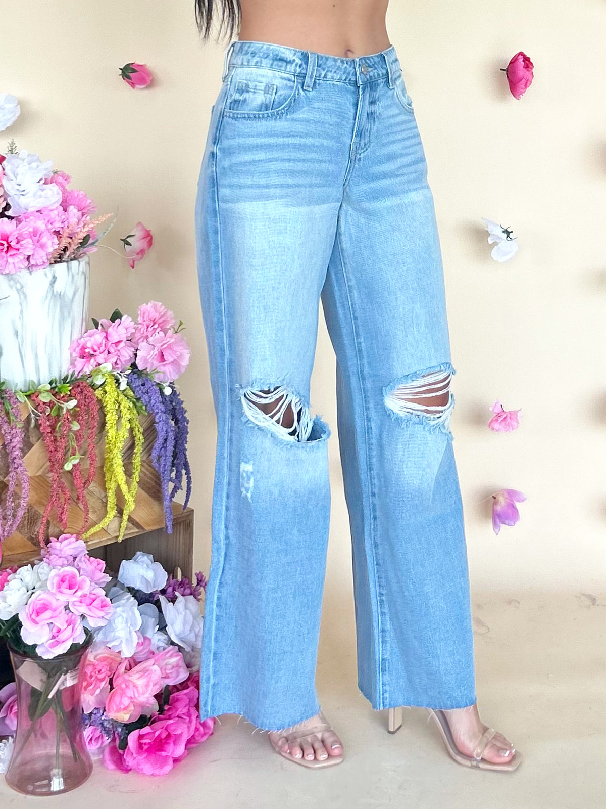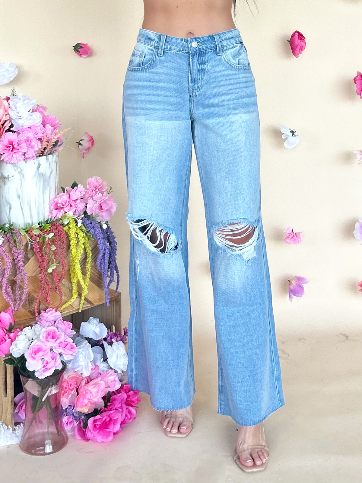 The Marti Jeans are a light wash, midrise, baggy fit Jean with distressed knee detail and a raw hem.