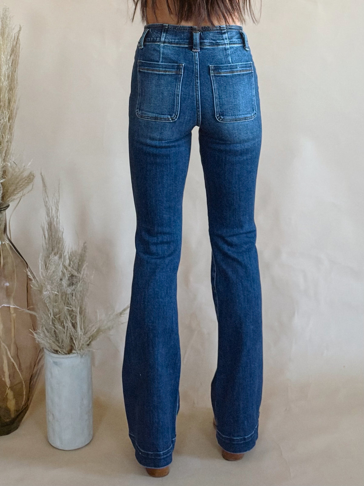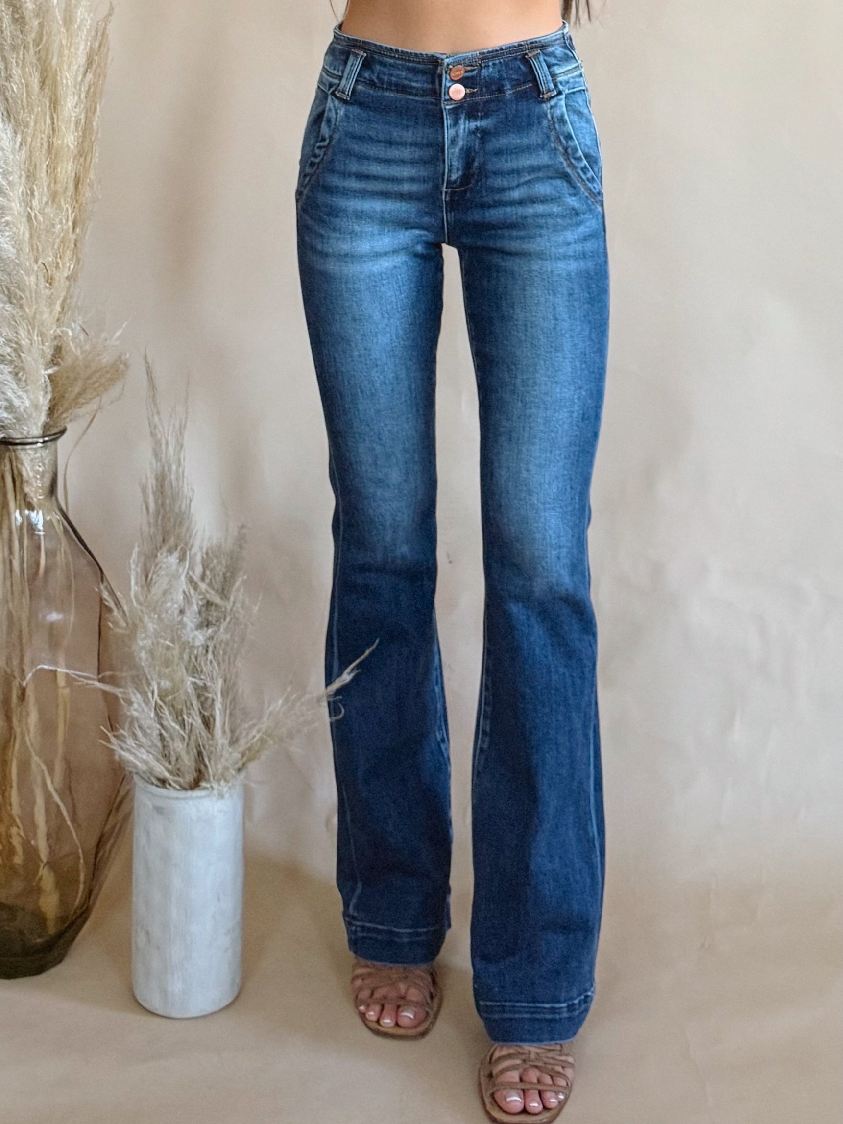 The Monica Jean is a dark wash, high rise, bootcut Jean with double button detail.