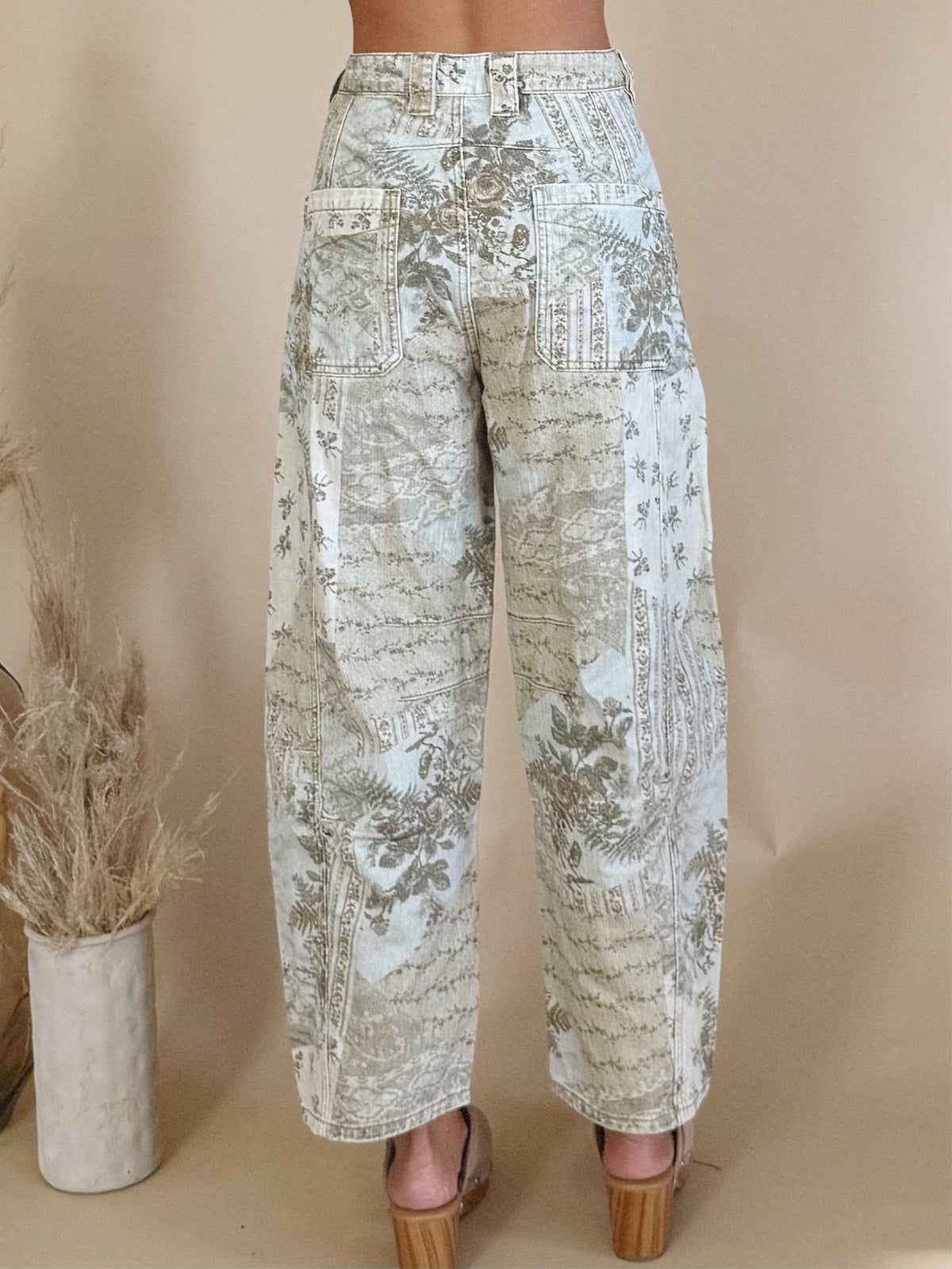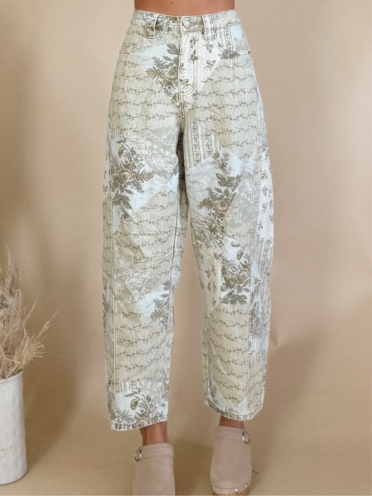 The Shelbie Pants are a barrel leg pant with a floral print.