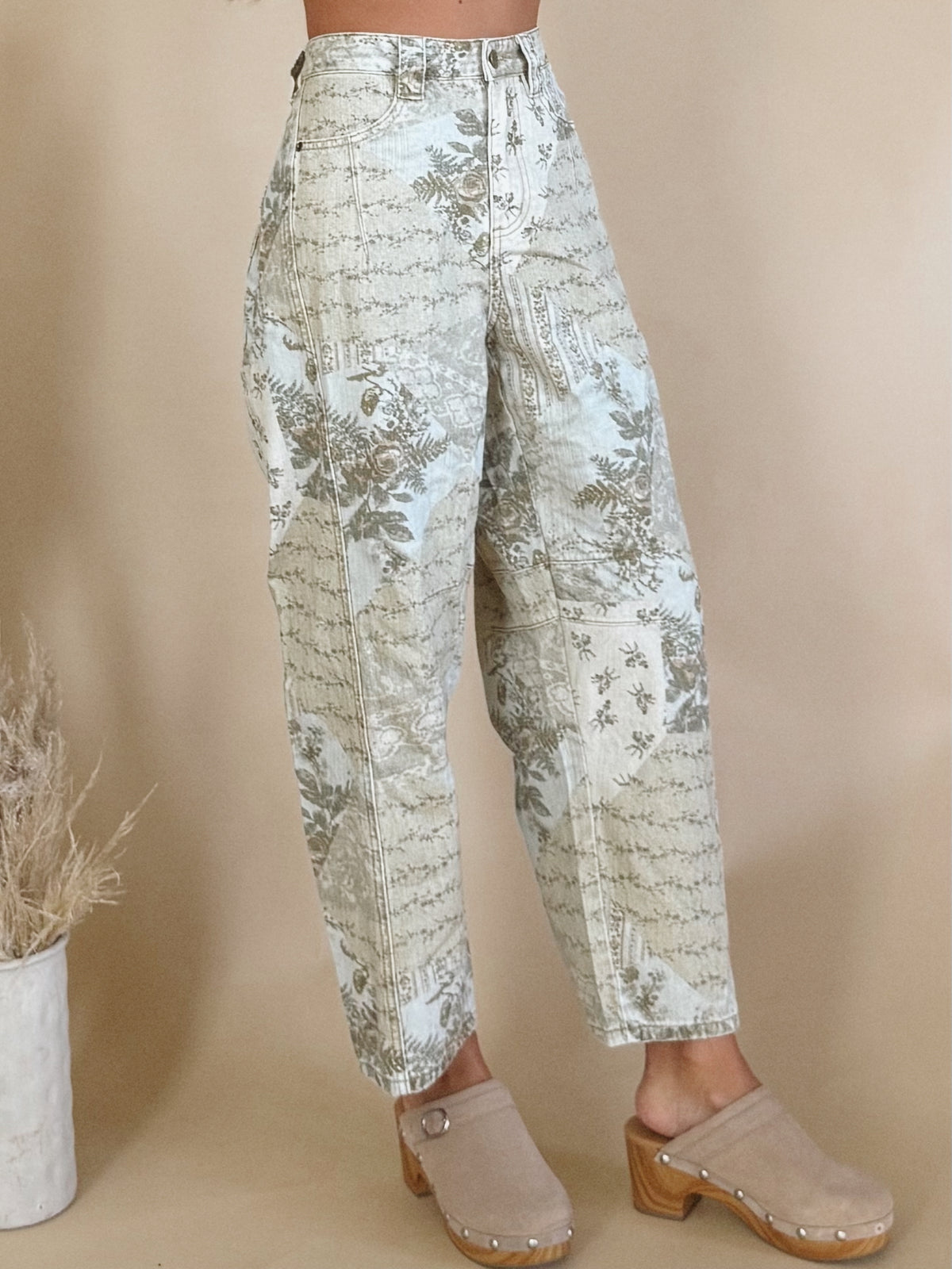 The Shelbie Pants are a barrel leg pant with a floral print.