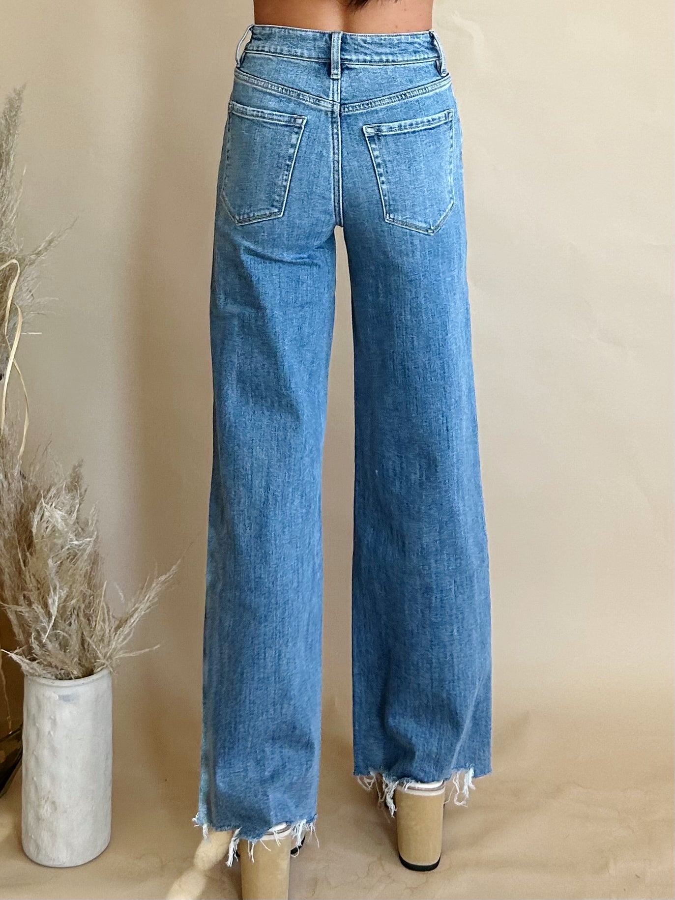 The Tracie Jeans are a medium wash straight Jean with a raw cut hem.