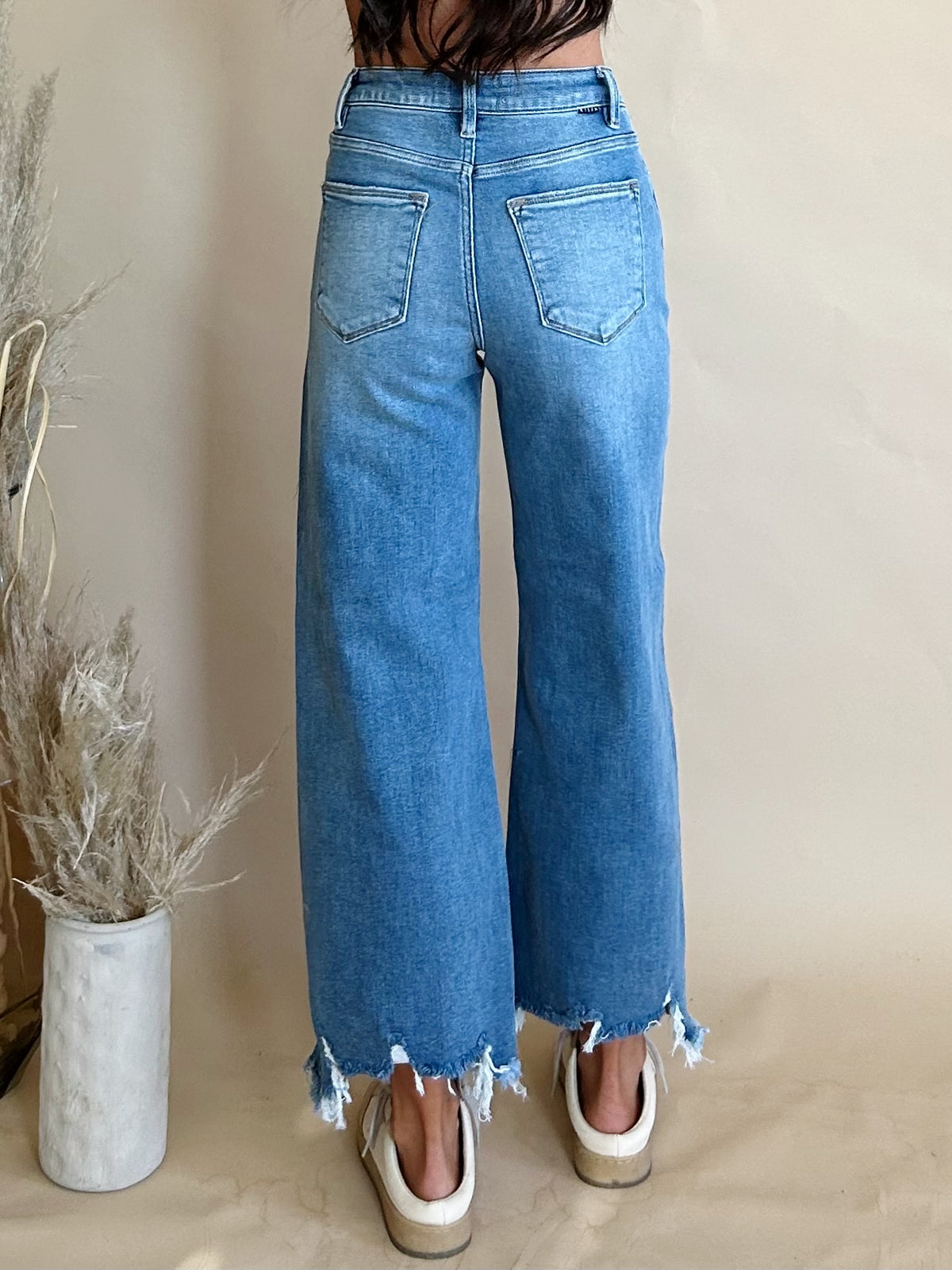 The Tulsa Jeans are a medium wash, wide leg crop jean with distressed bottom.
