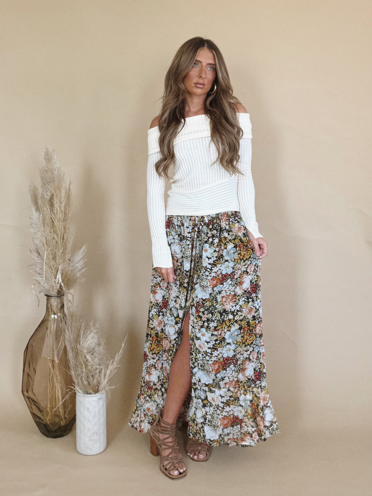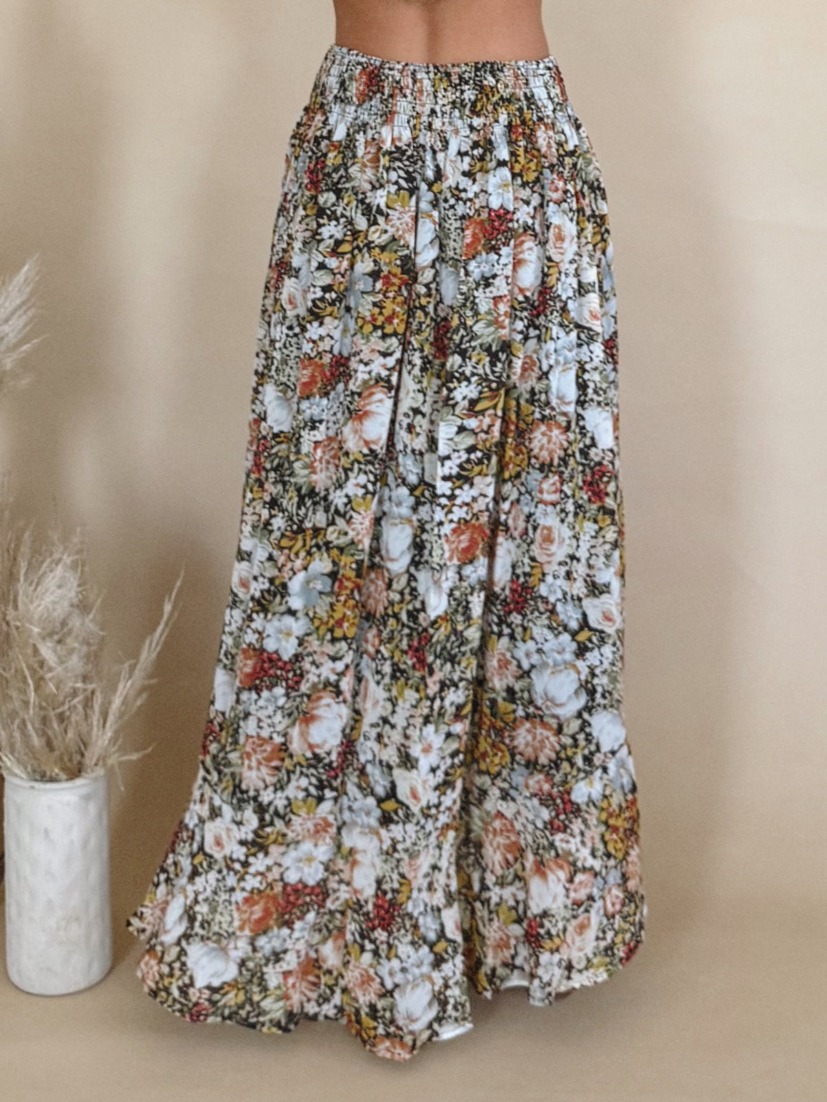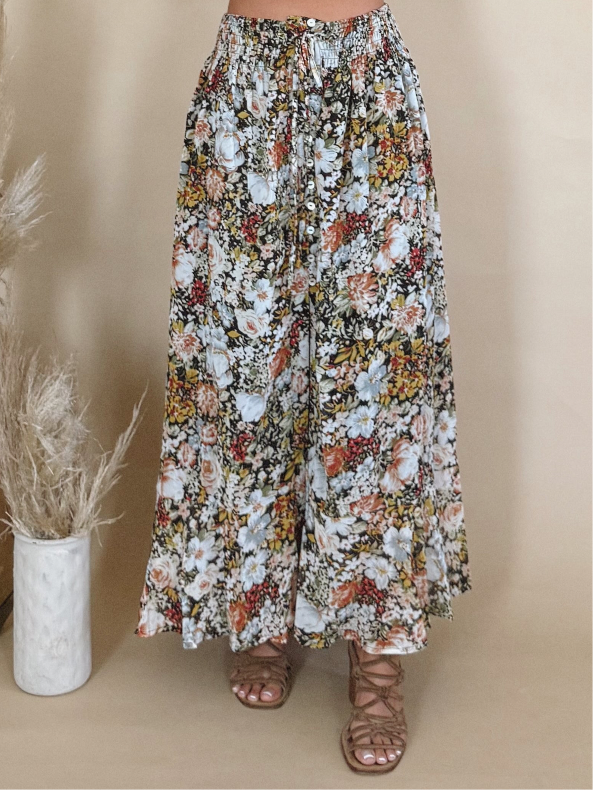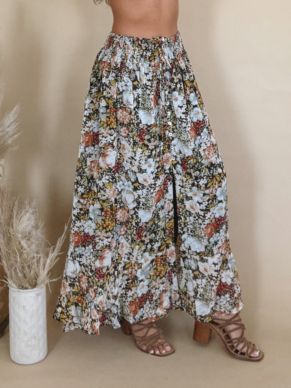 The Winona Skirt is a floral skirt with a slit down the front and button detailing.