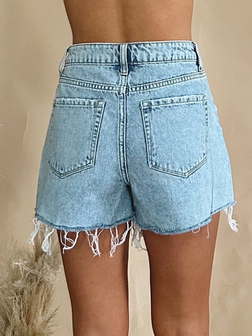 The Zaley Shorts are a medium wash mid rise denim short with distressing at the bottom.