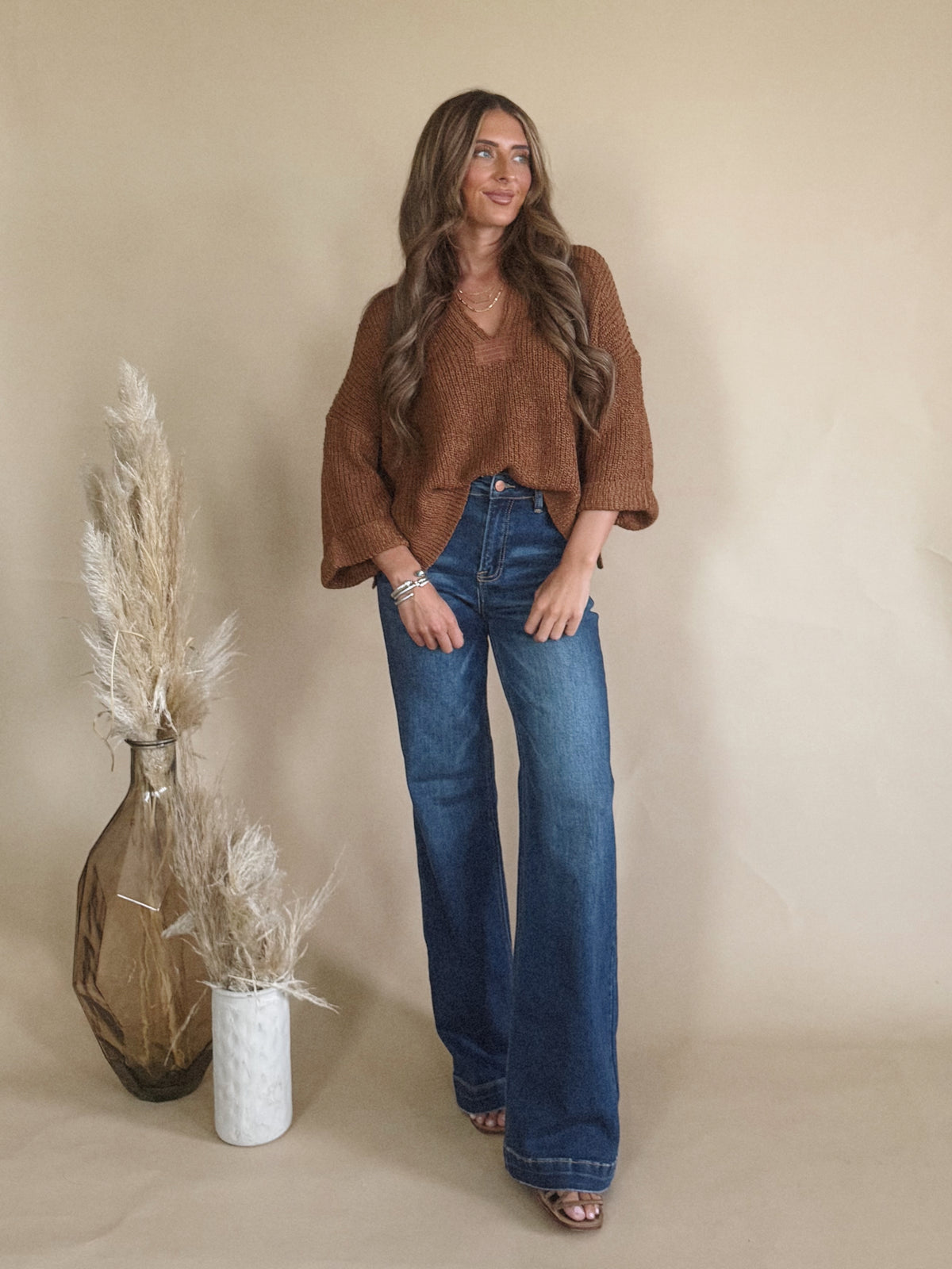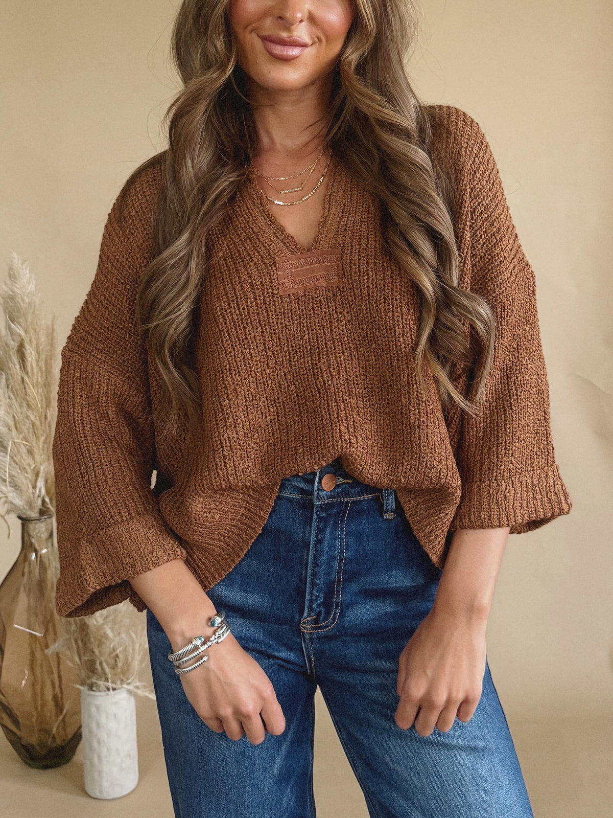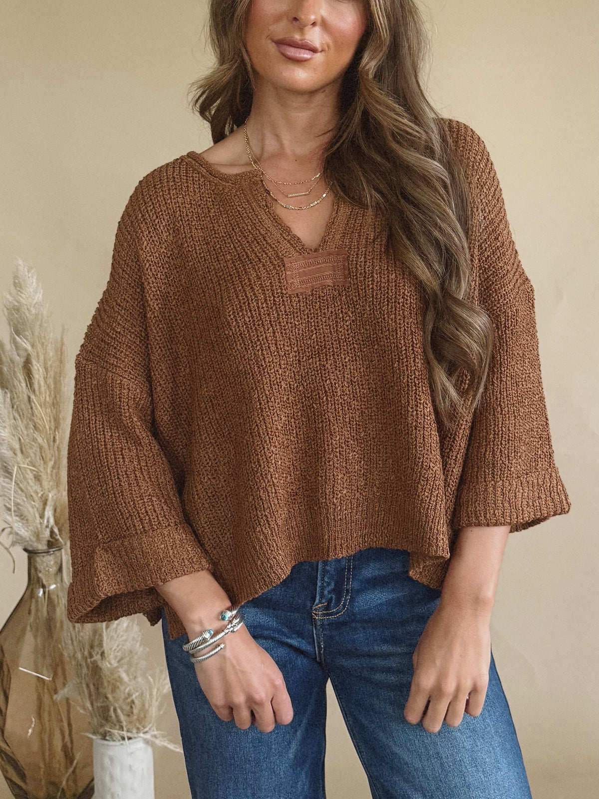 The Kathryn Top is a v-neck, quarter sleeve sweater with rolled sleeve detailing.