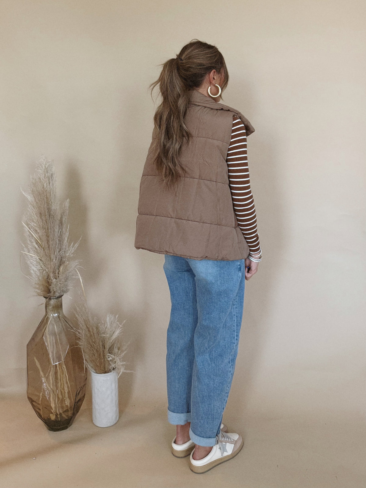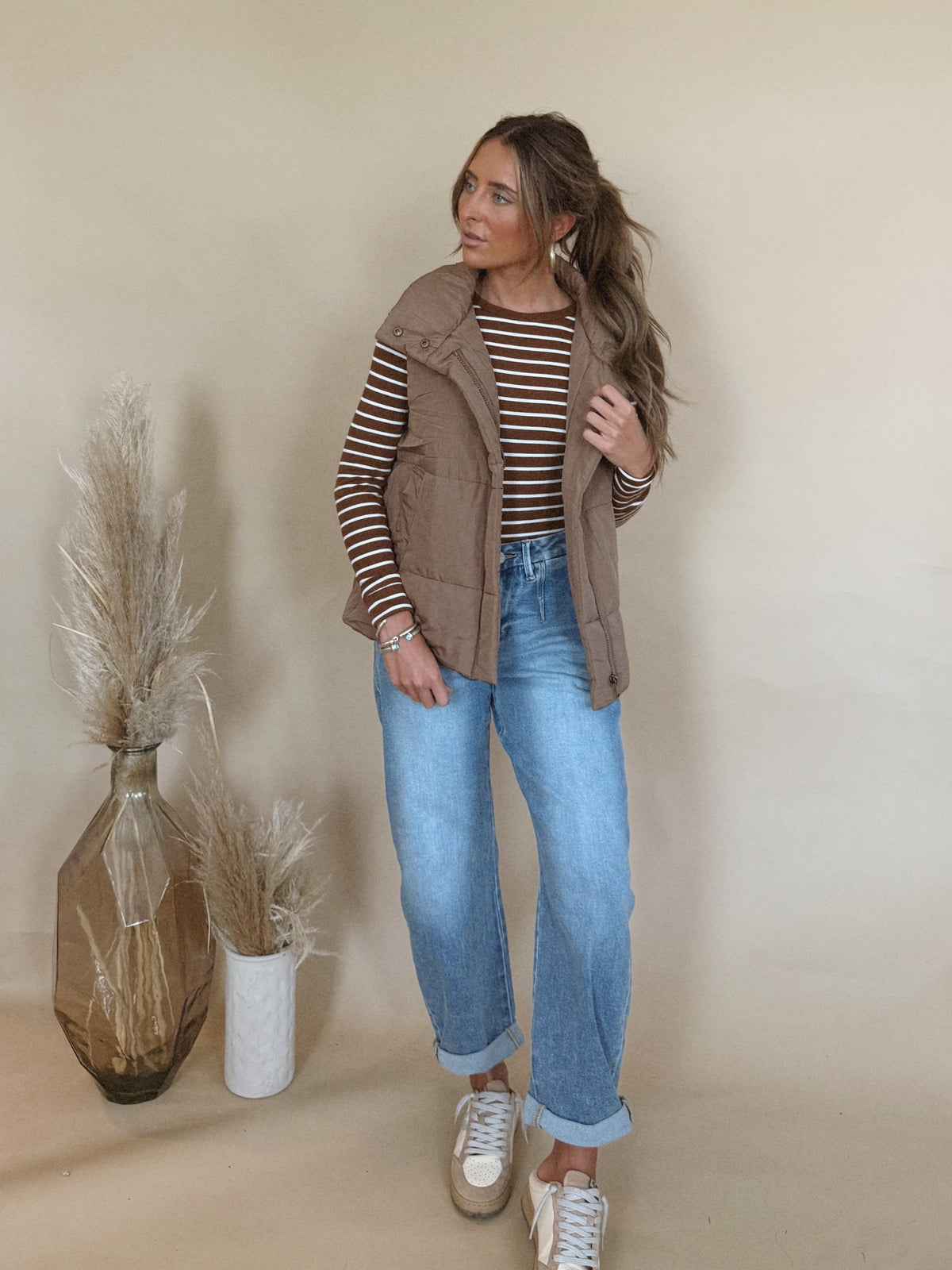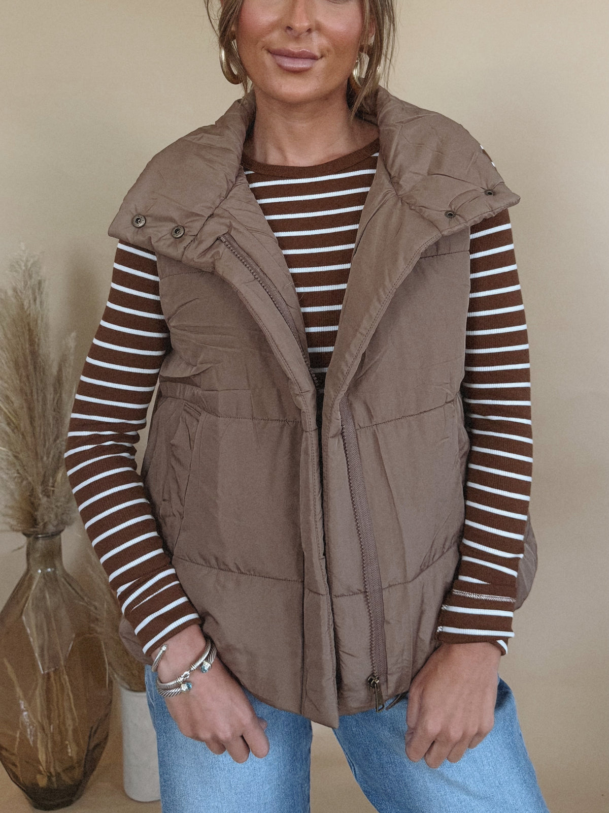 The Remi Vest is an oversized puffer vest with drawstring and button detail.