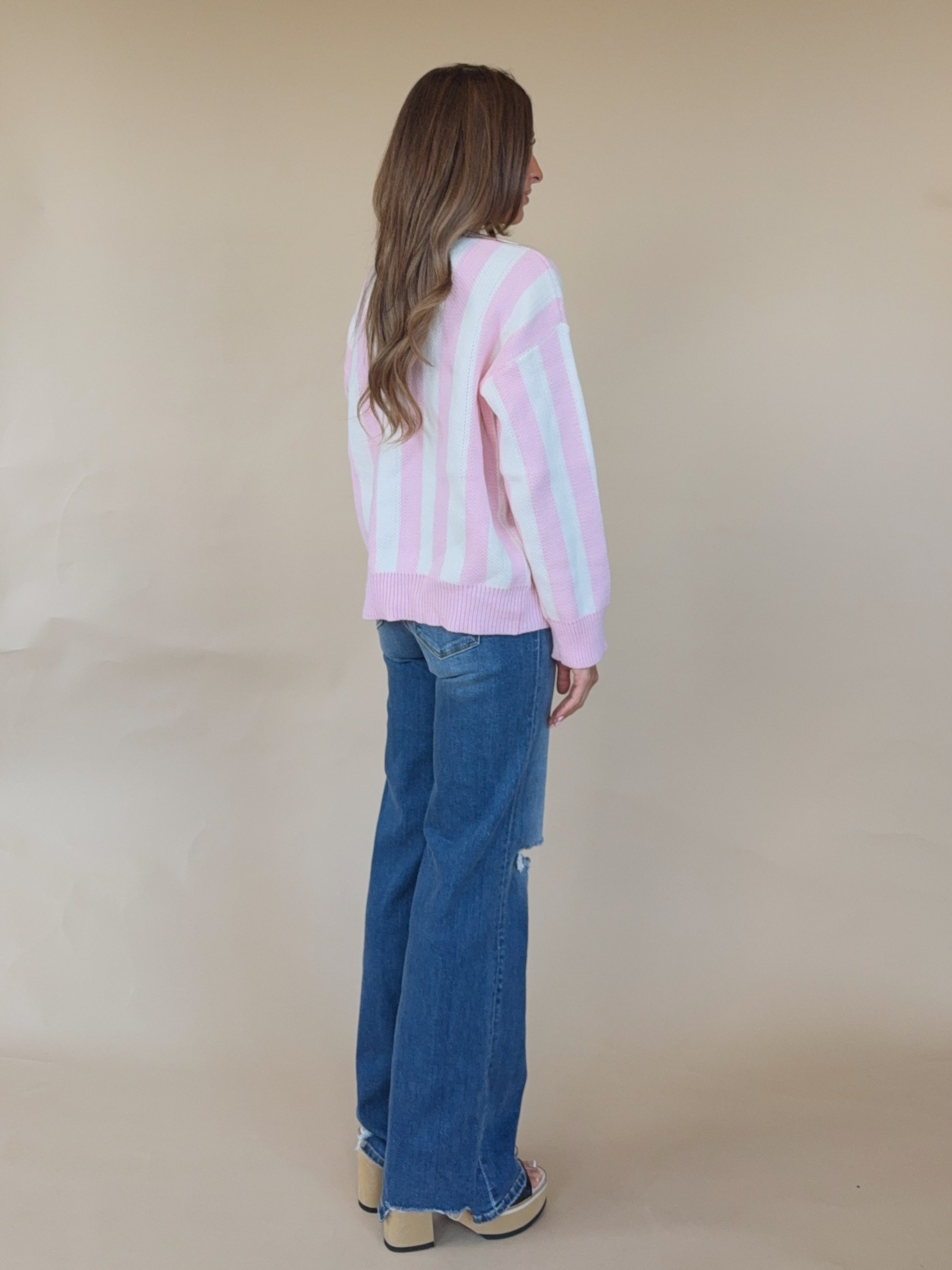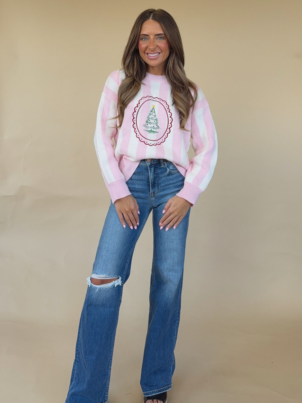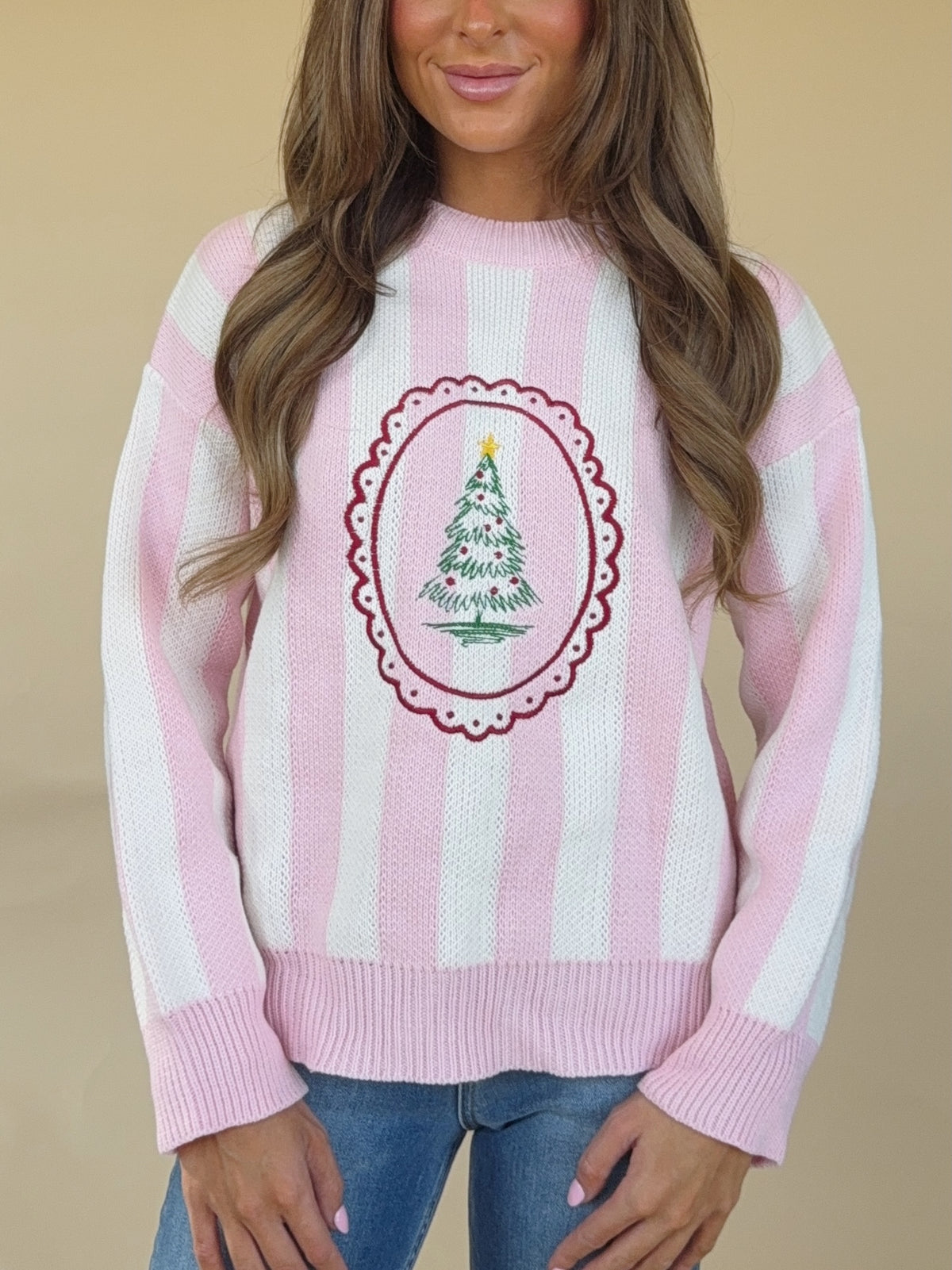 The Belle Top is a pink and white striped sweater with a stamped Christmas Tree detail.