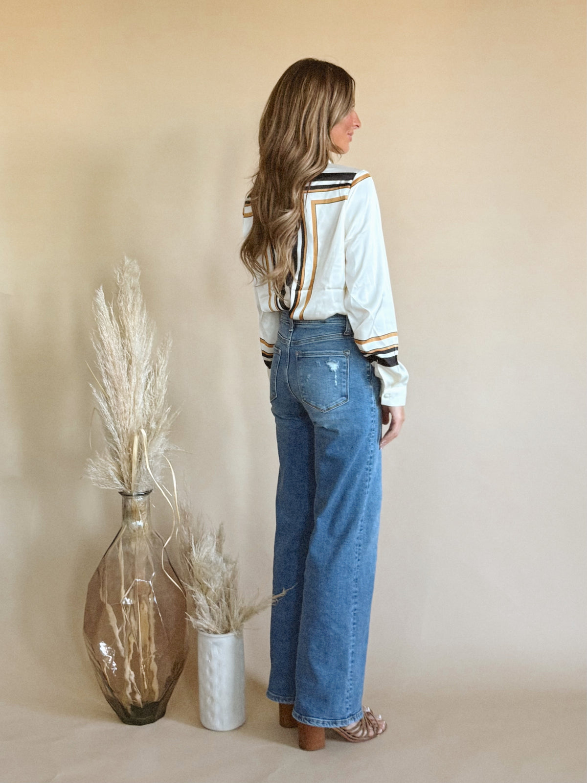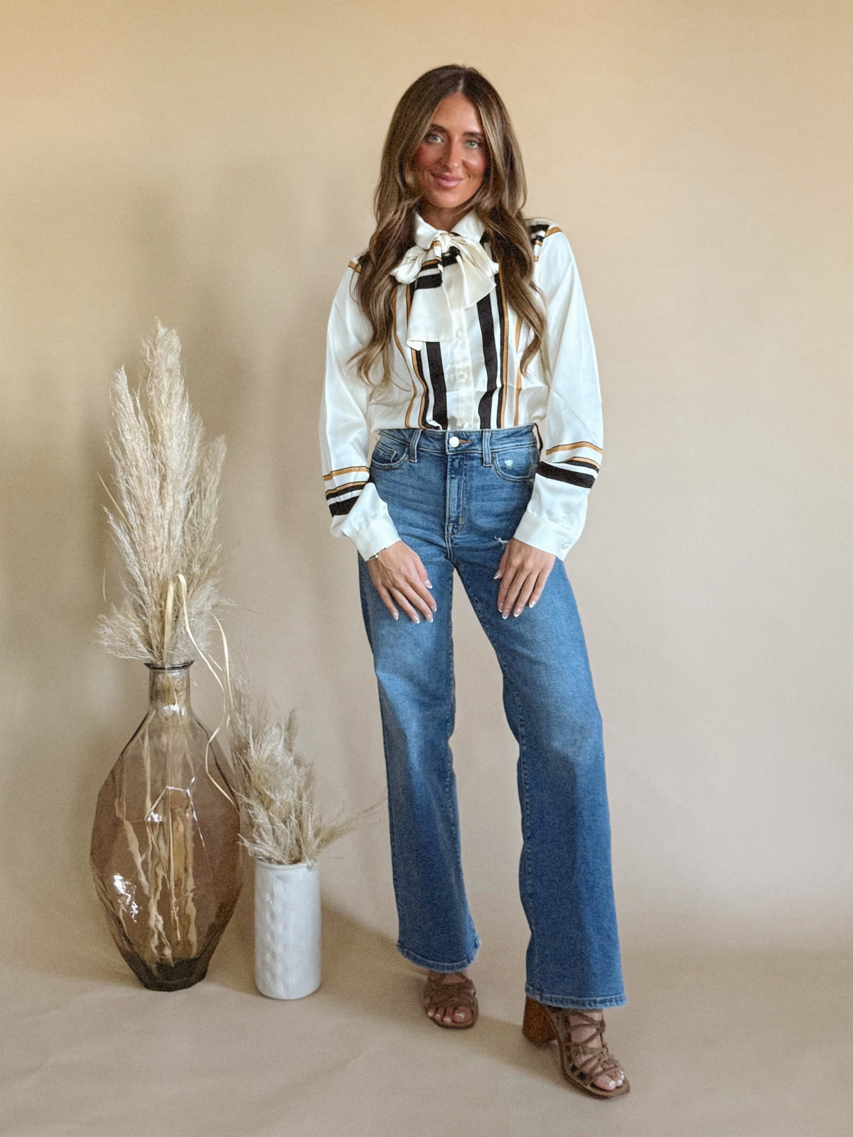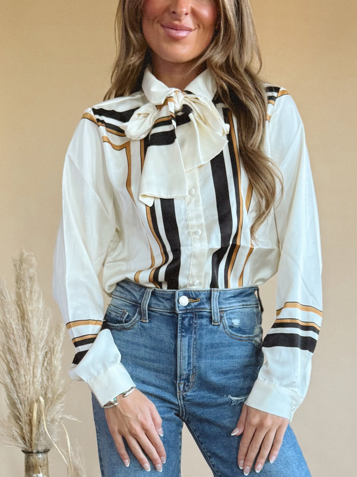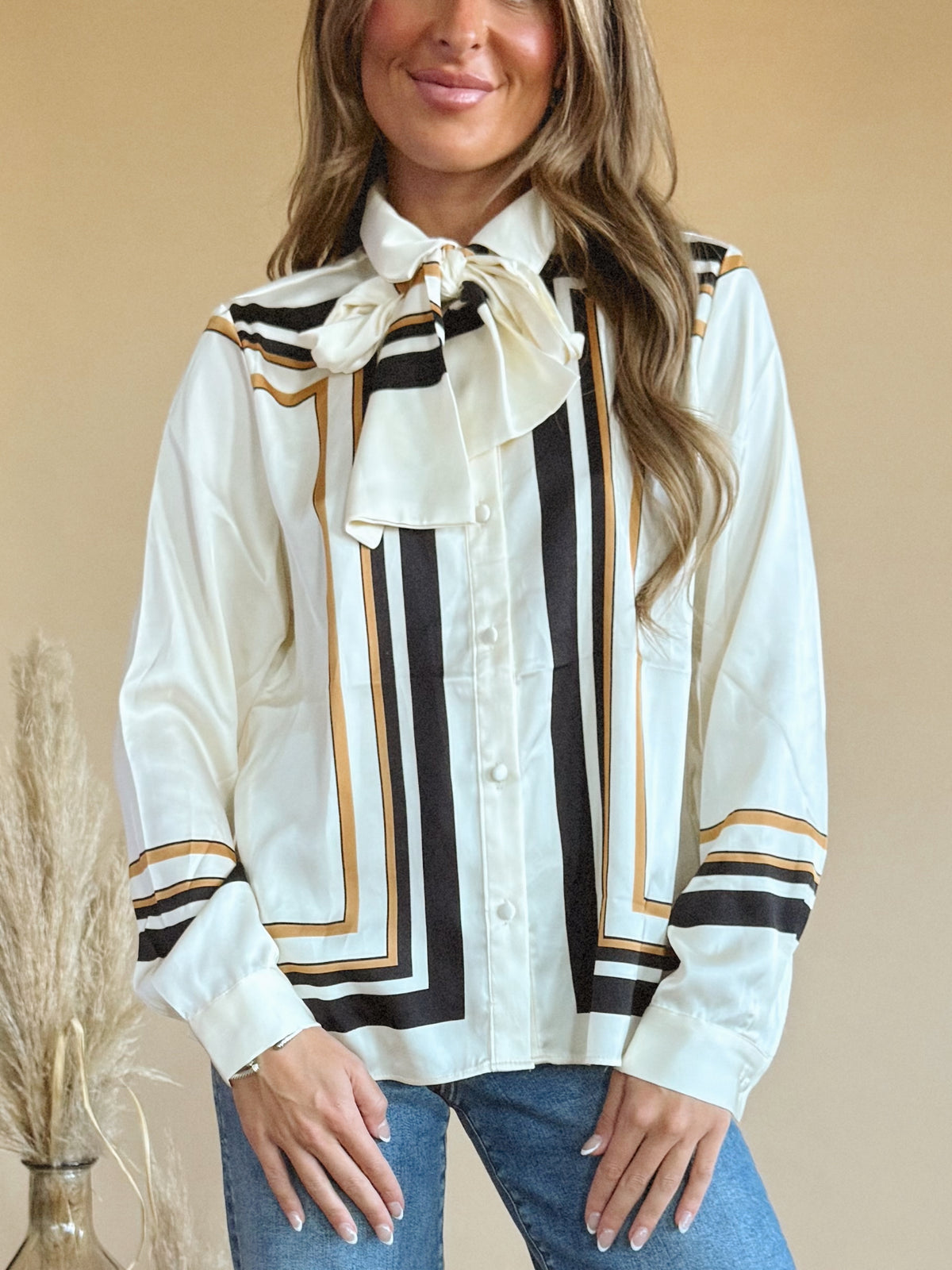 The Lexie Top is a long sleeve, printed, silk blouse with a collar and bow tie detail.