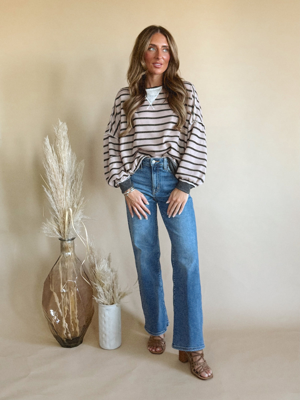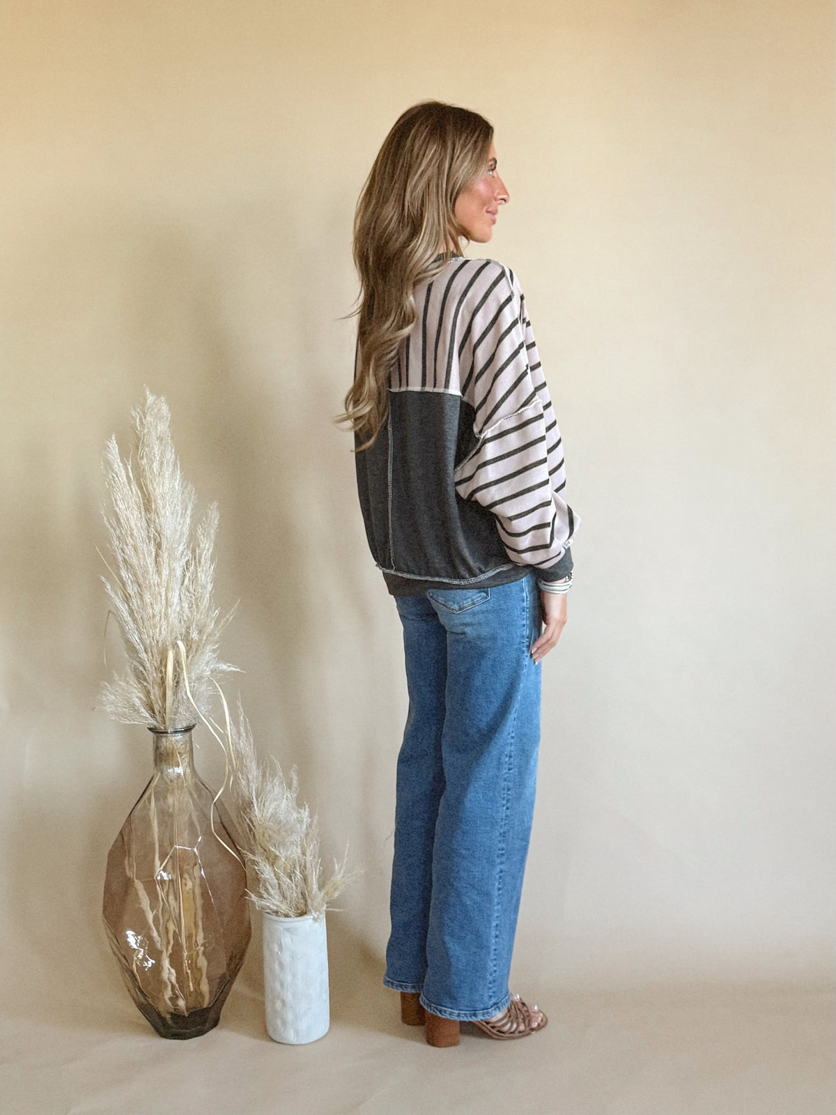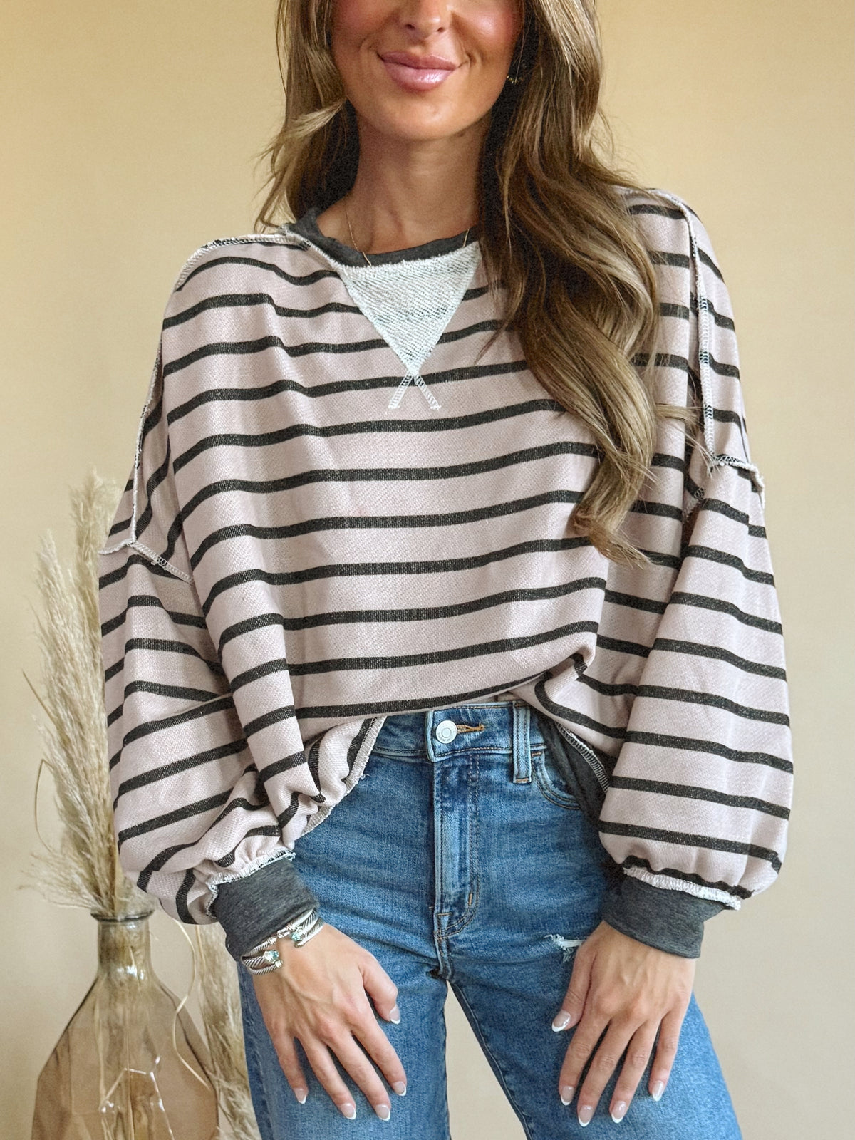 The Rowan Top is a long sleeve, striped top with a v detail and a colored hem.