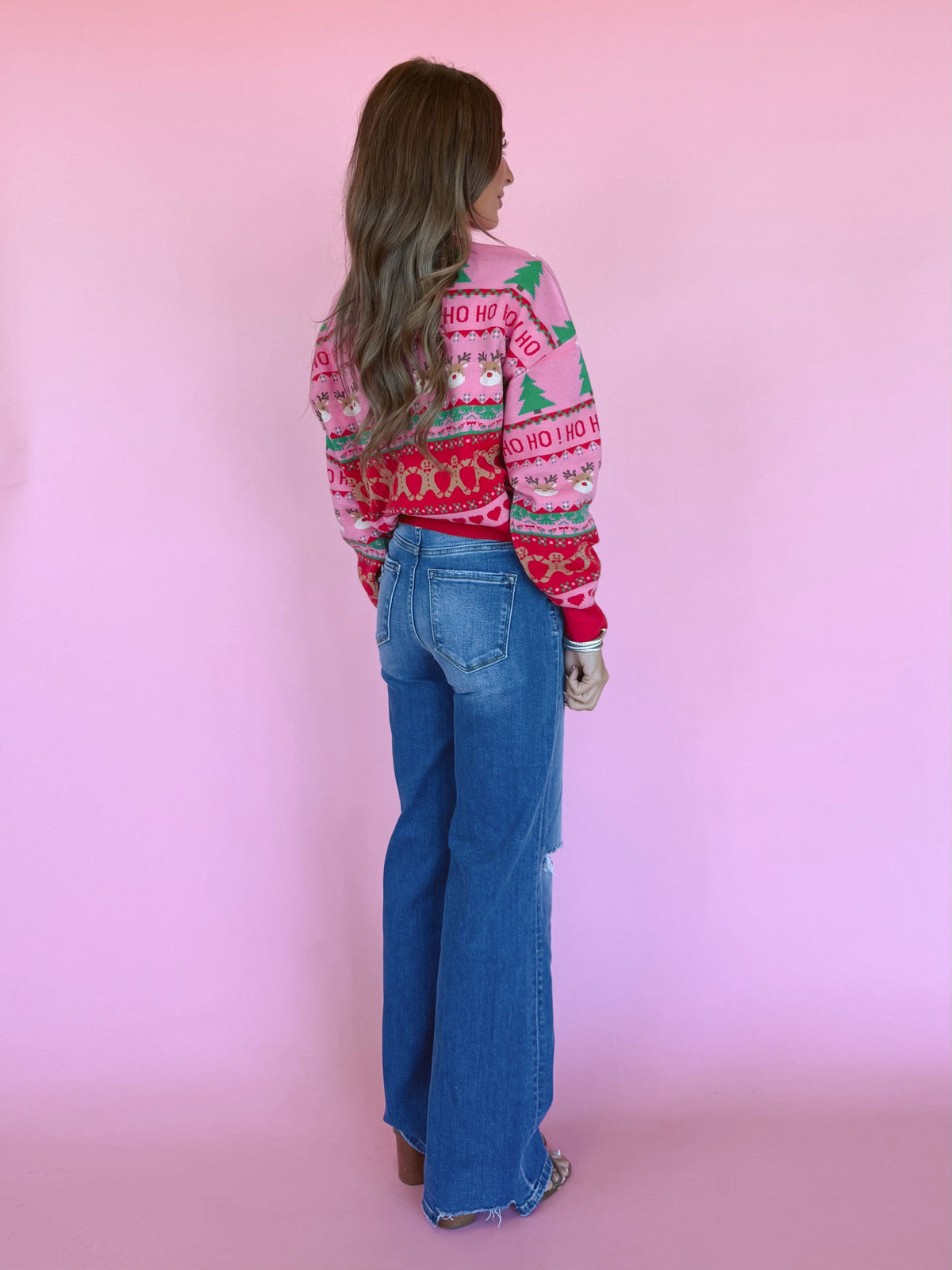 The Ruddy Sweater is a pink, red, and green Christmas sweatshirt with reindeer, gingerbread, and heart print.