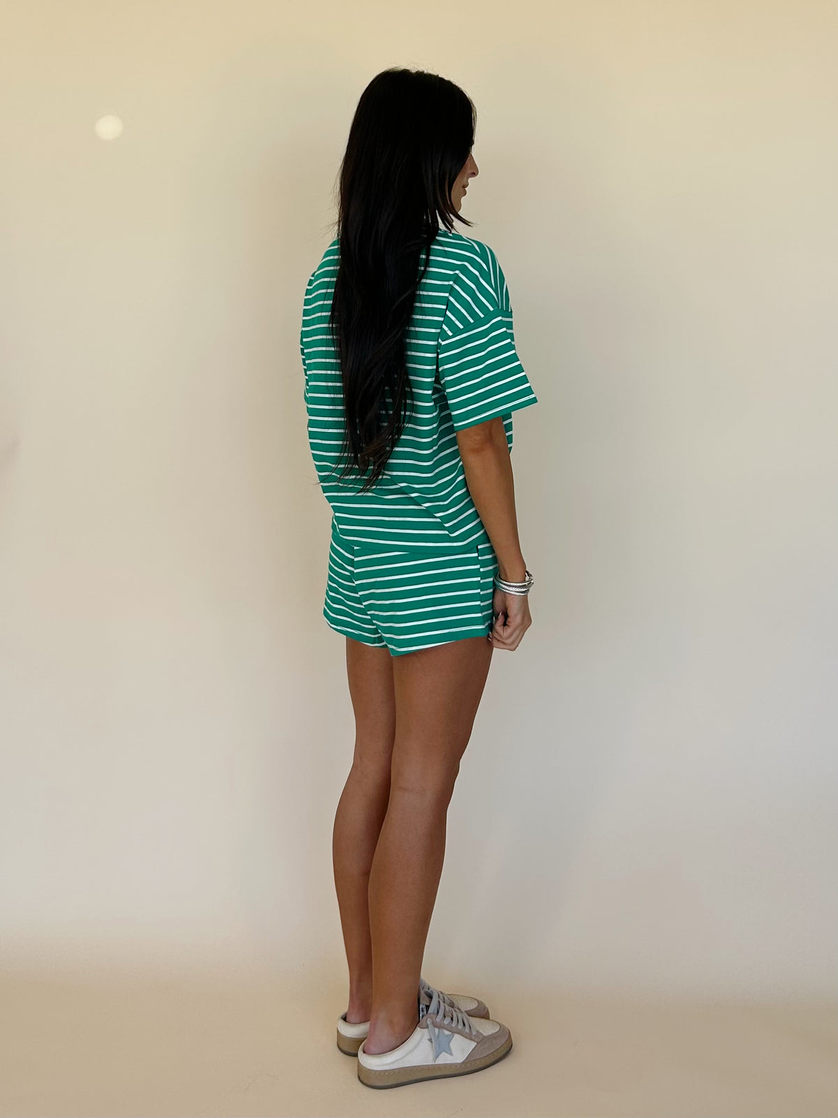 The Stella Set is a striped short sleeve set with neck stitching on the top, and a drawstring short.