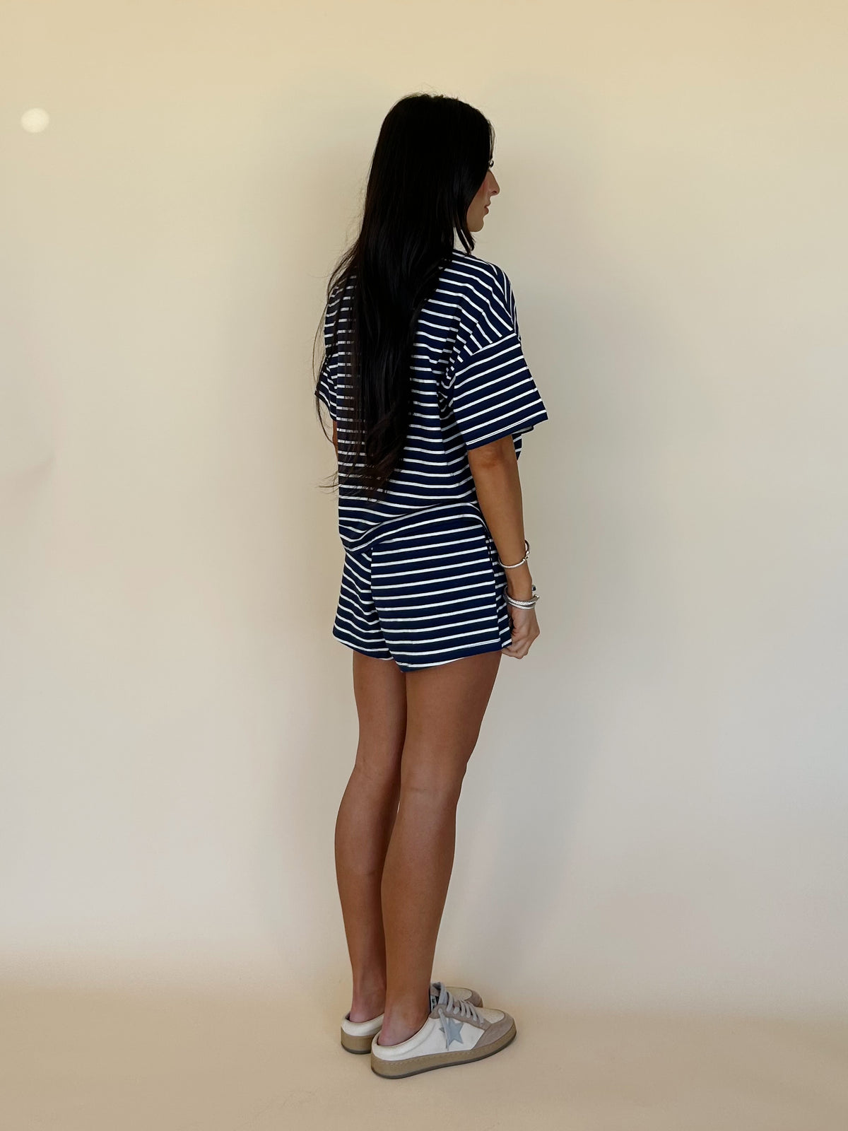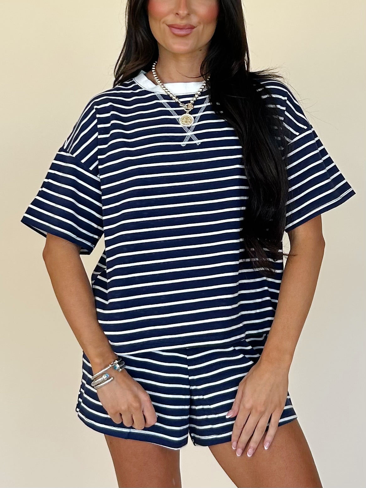 The Stella Set is a striped short sleeve set with neck stitching on the top, and a drawstring short.
