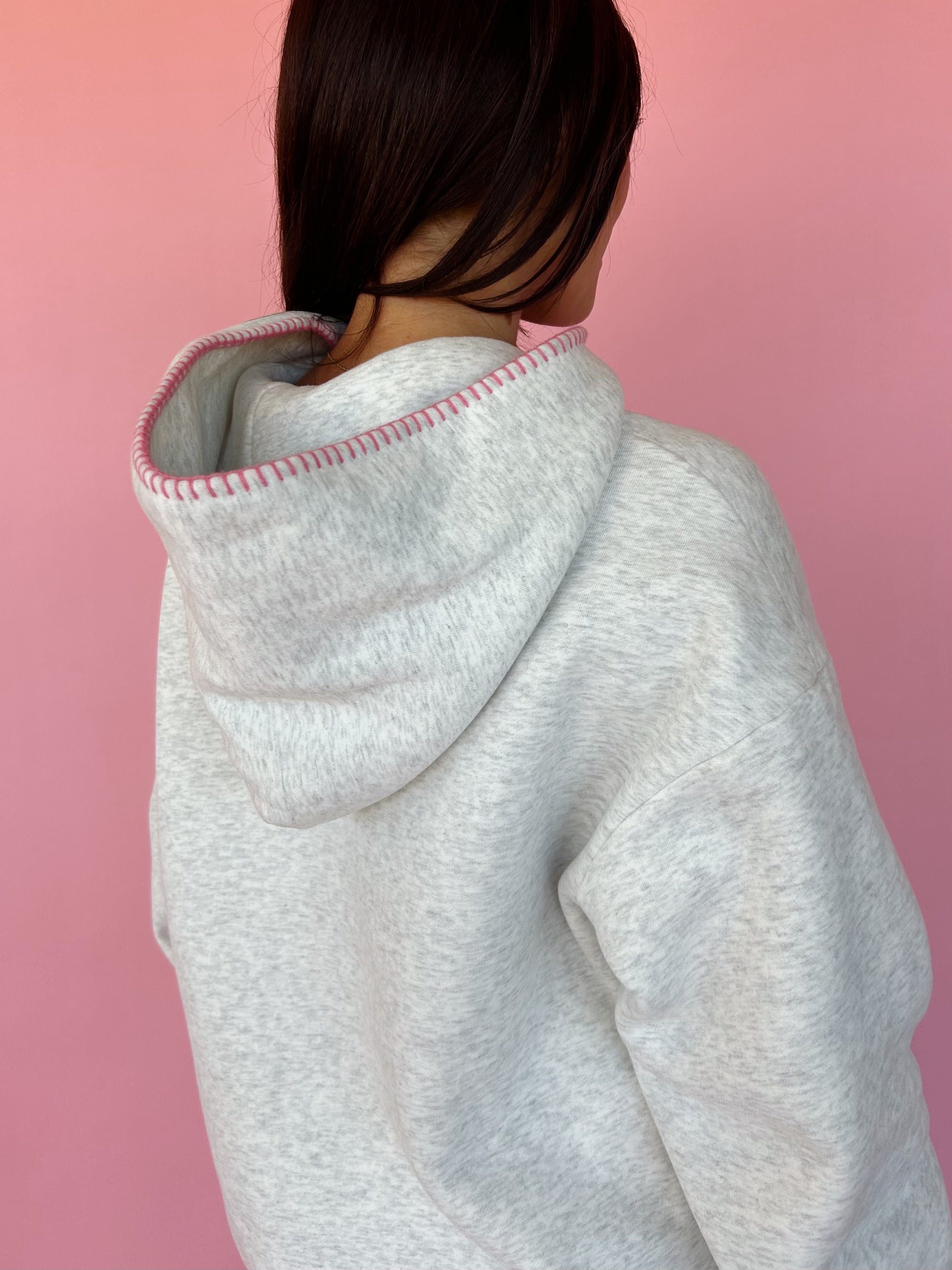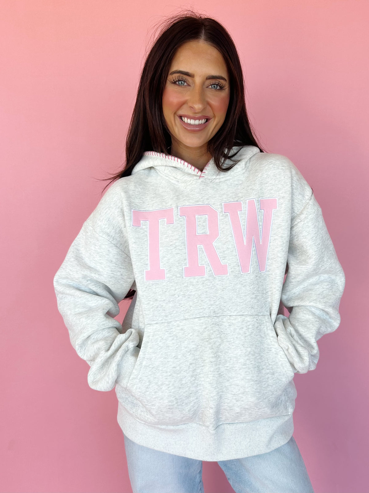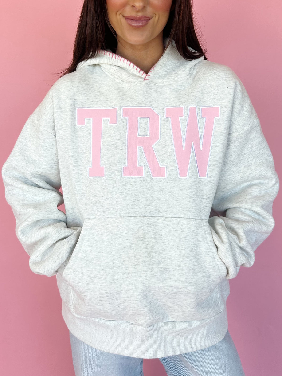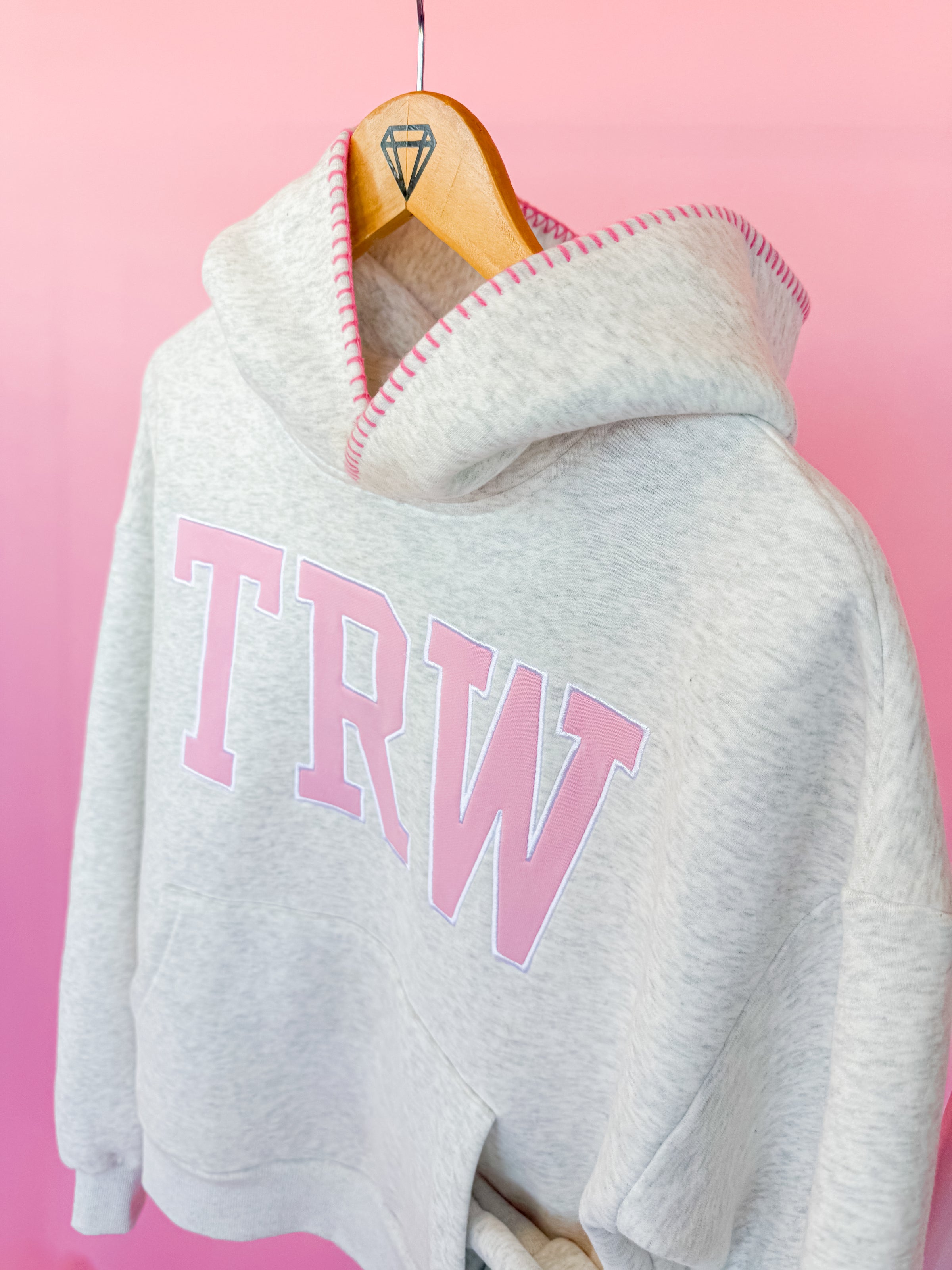 Ash Grey Hoodie with Pink Stitch Detail Around the Hood with Embroidered Patch TRW. Kangaroo Pocket.