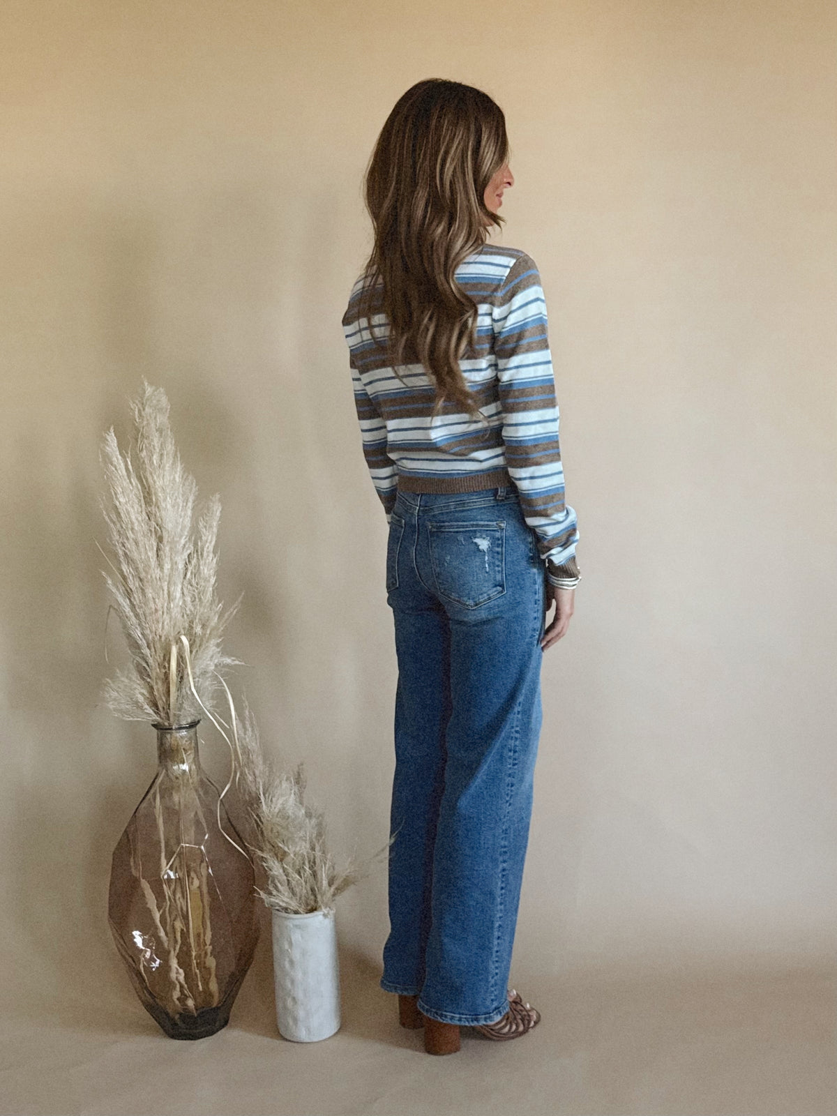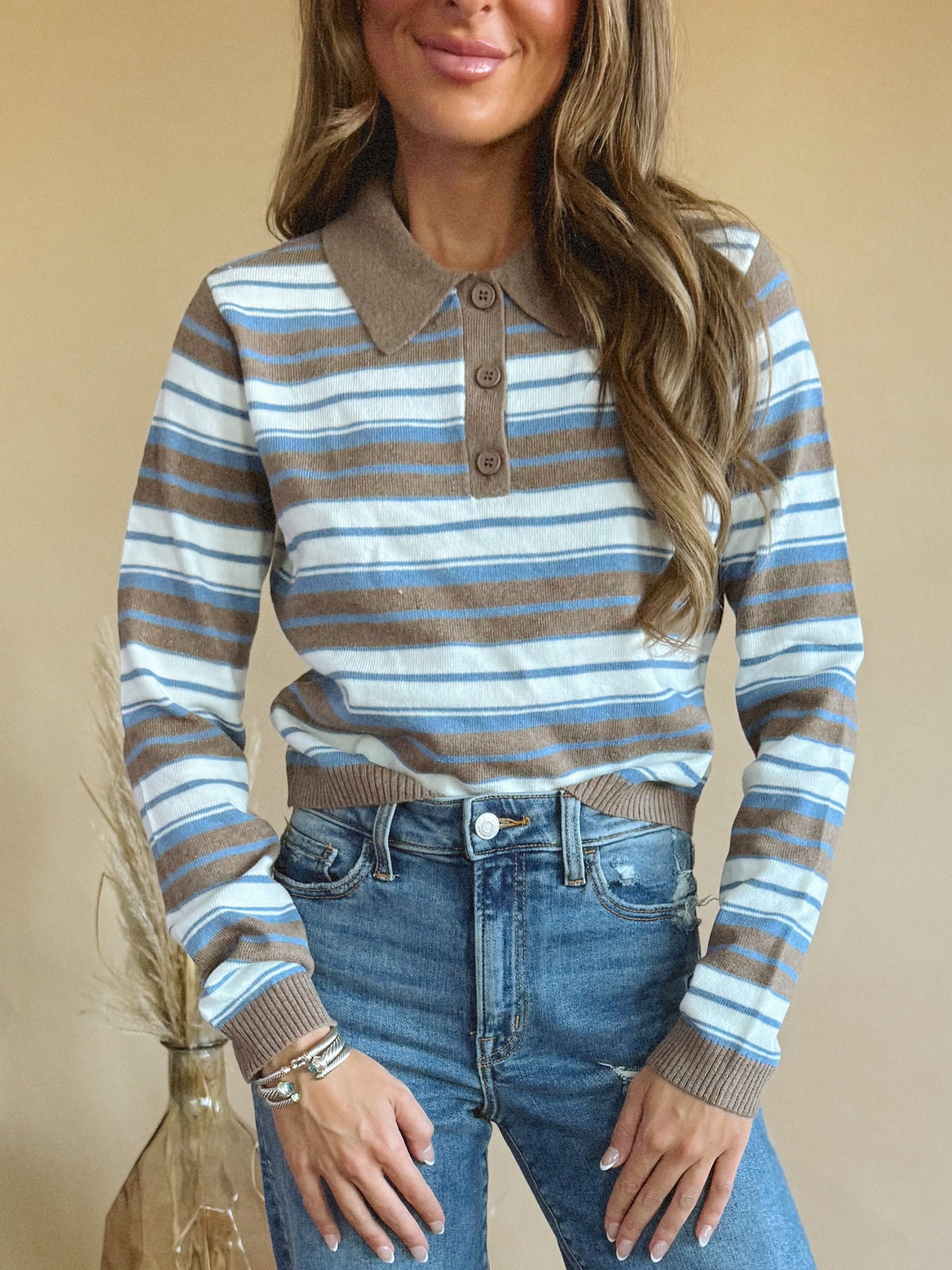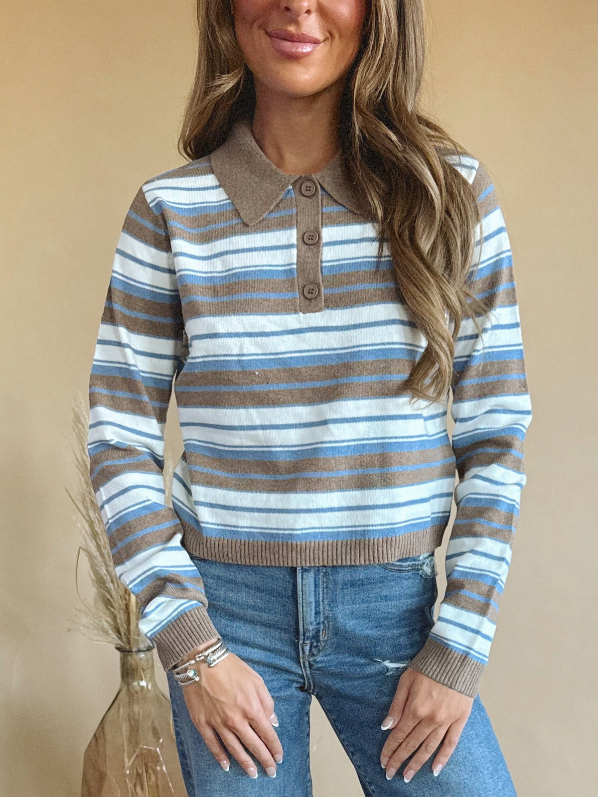 The Beth Ann Top is a long sleeve, striped top with a crop fit and a collar detail.