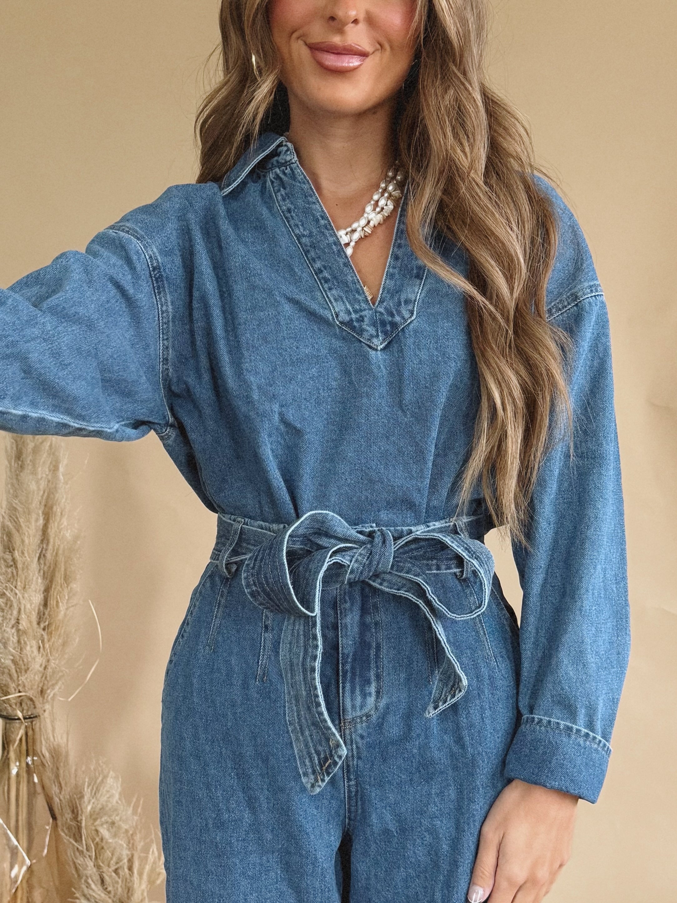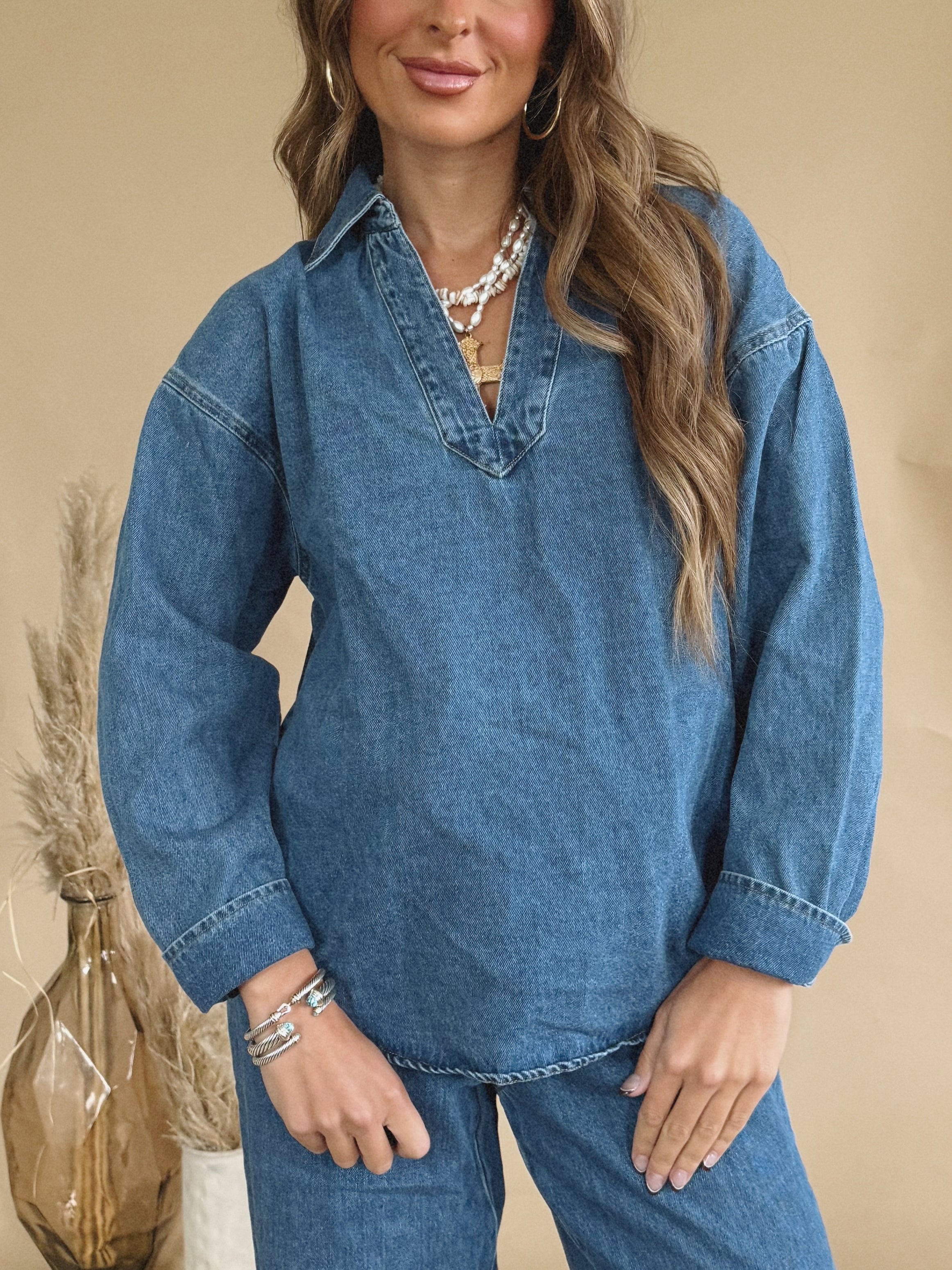 The Dakota Top is a denim long sleeve top with a v-neck detail.