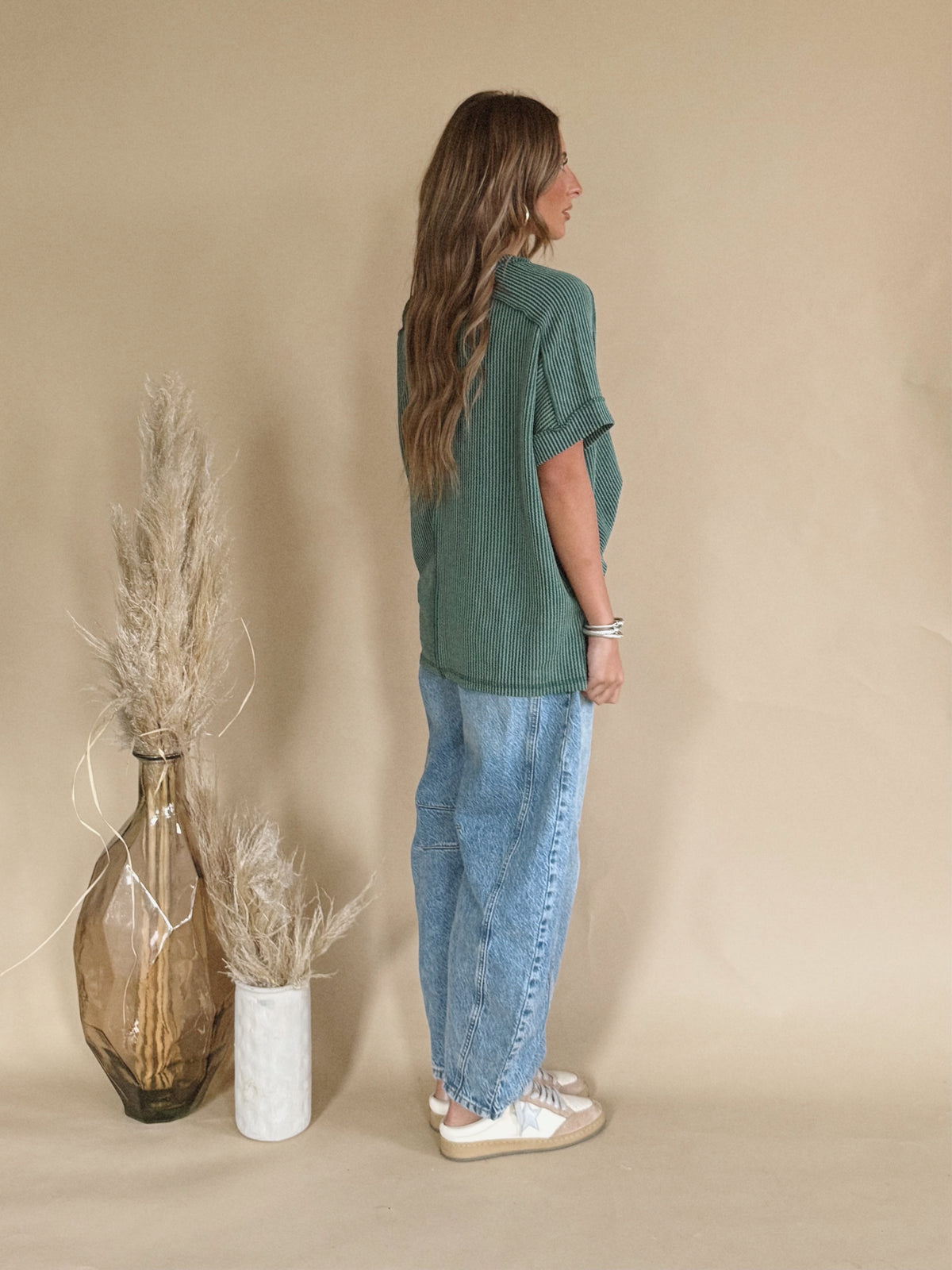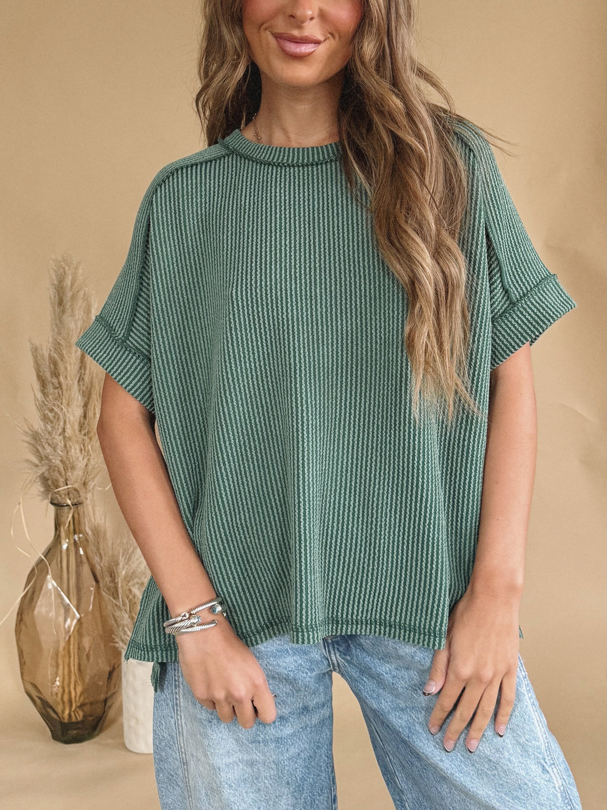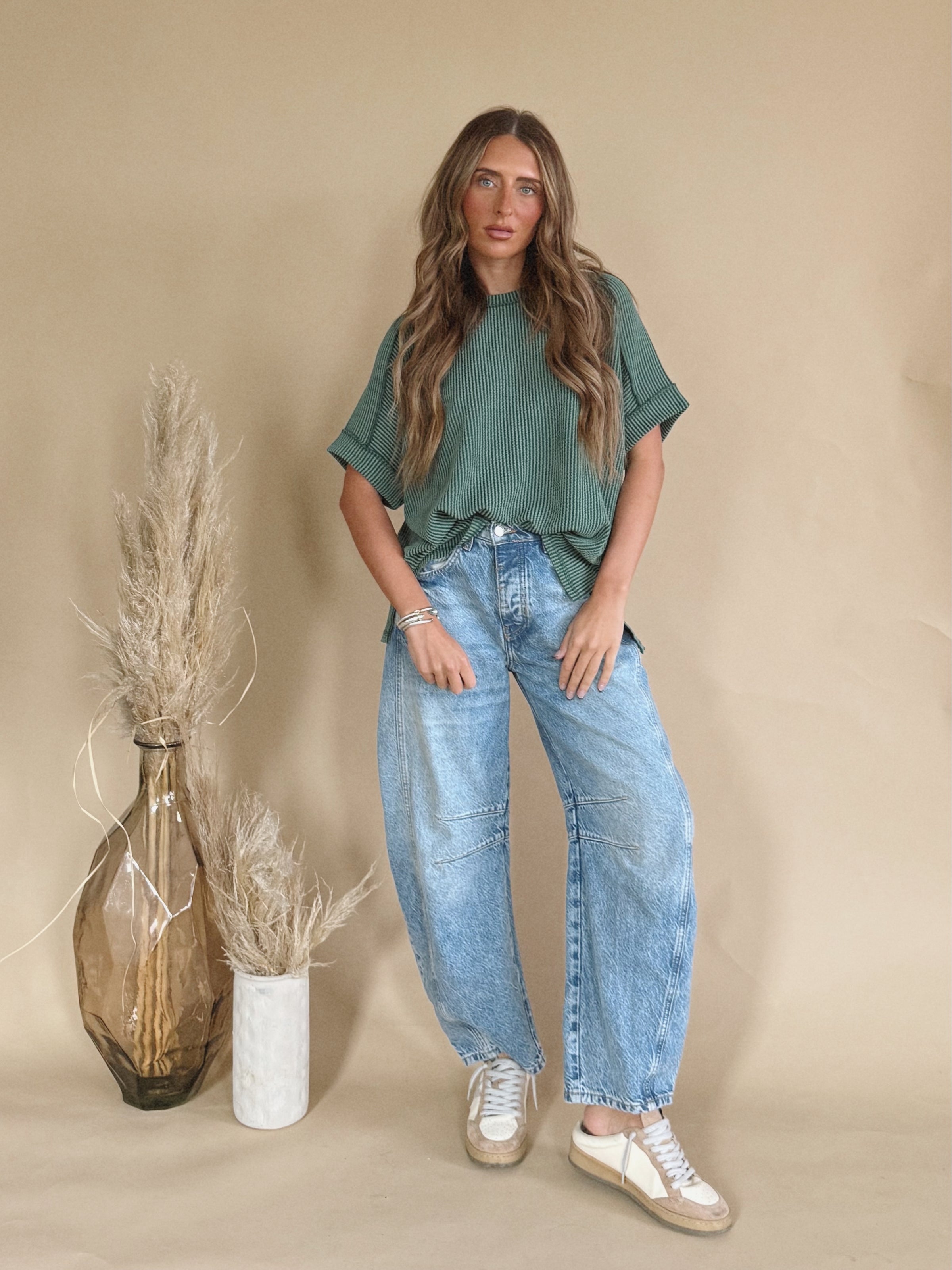 The Elowen Top is a ribbed short sleeve top.