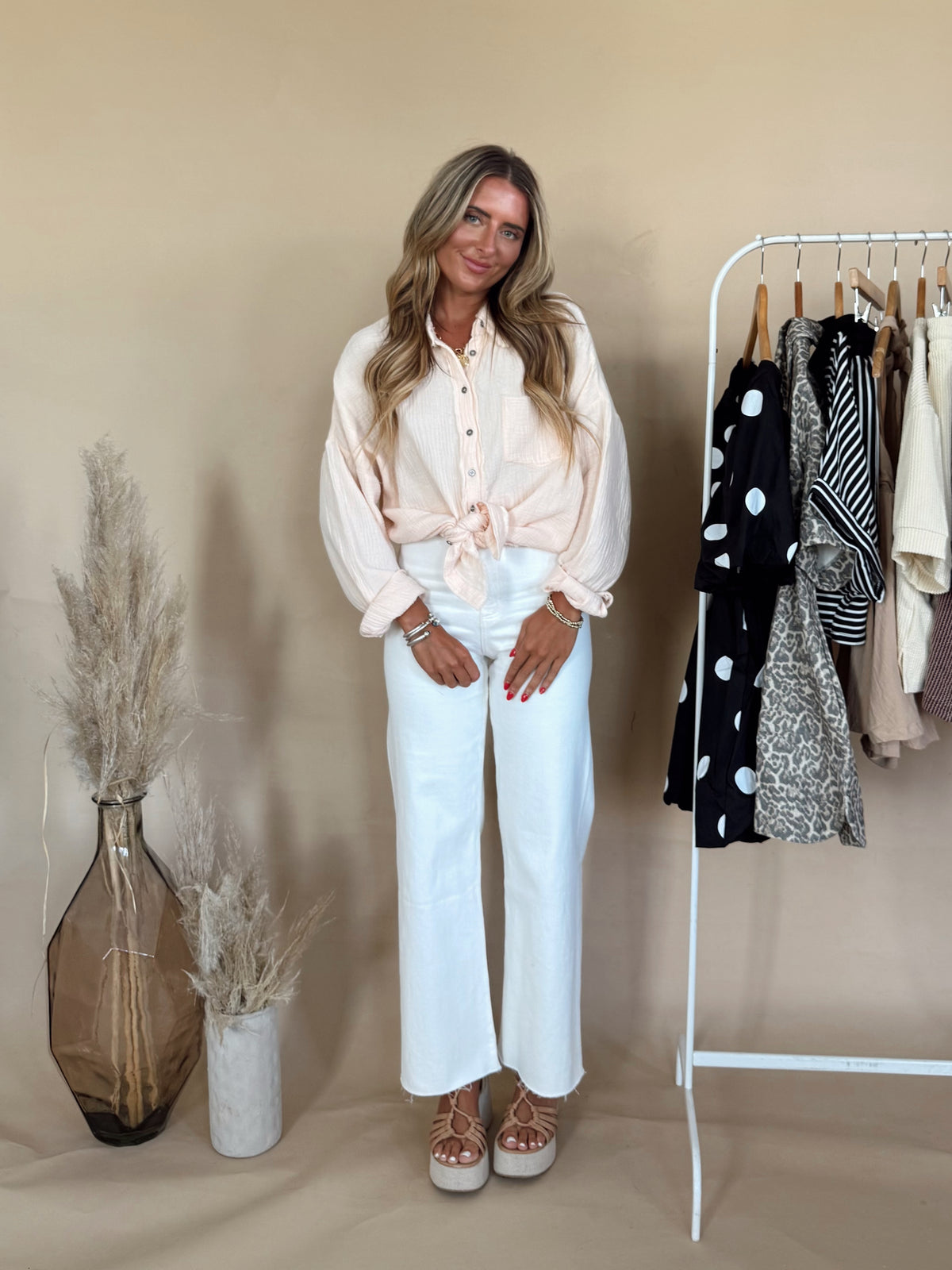 The Harper Top is a lightweight, raw hem, button up top with a collar.