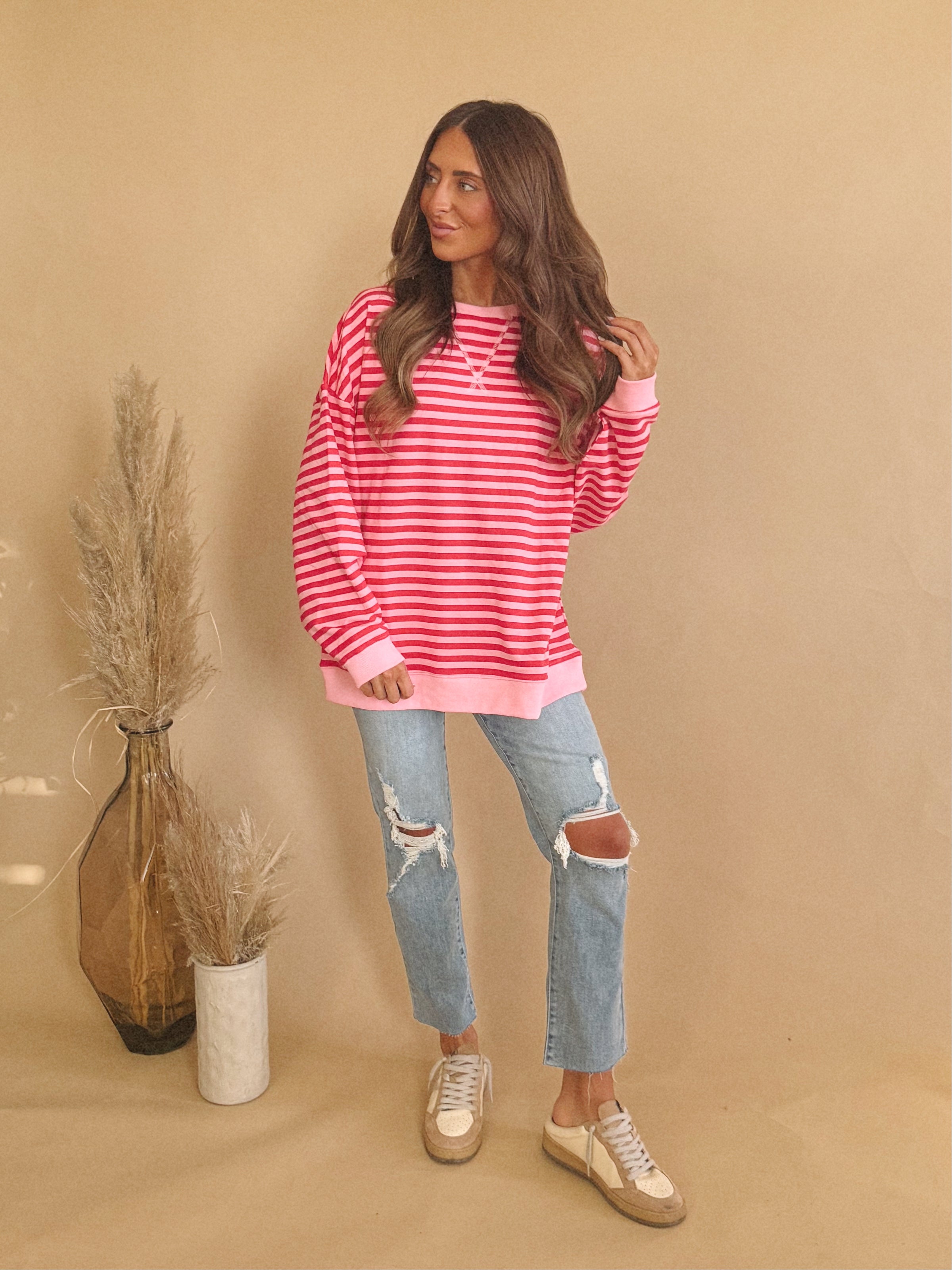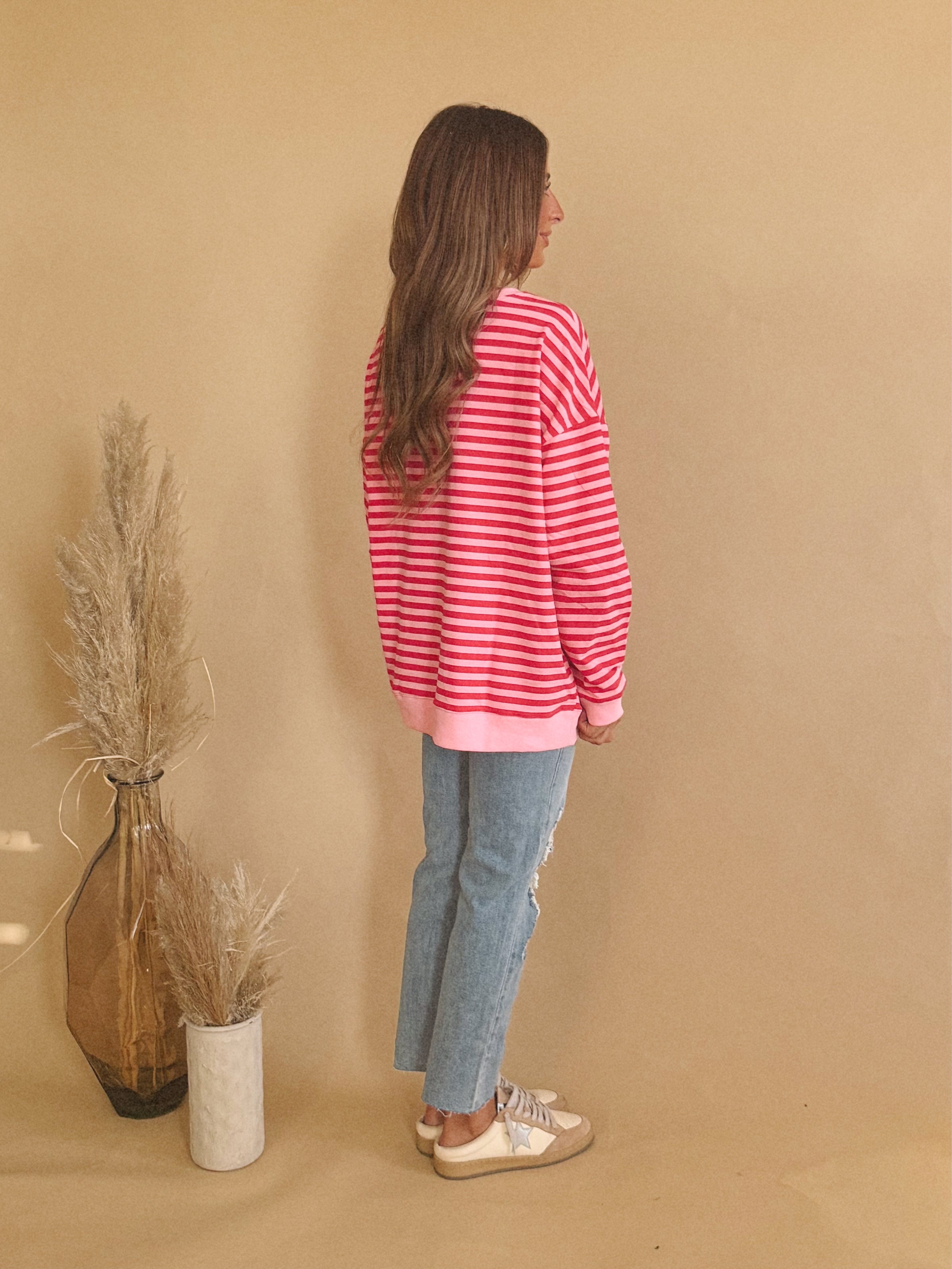 The Heidi Top is a pink long sleeve striped top with a thick bottom and sleeve hem.