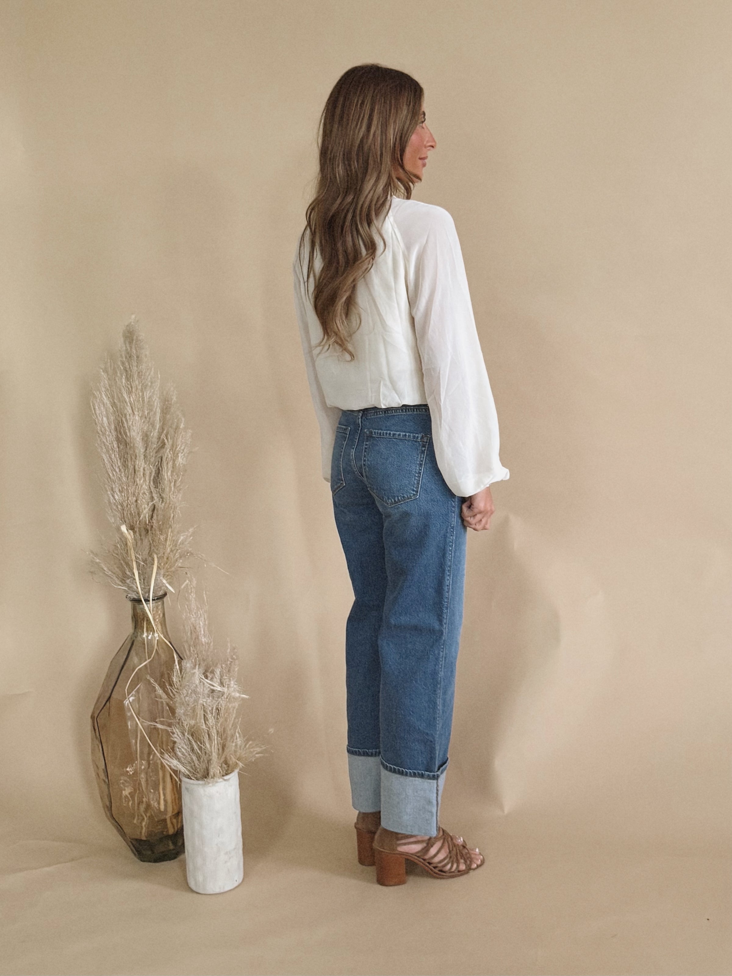 The Rylie Top is a long sleeve blouse with a key hole detail and gold piece. Available in 4 colors.