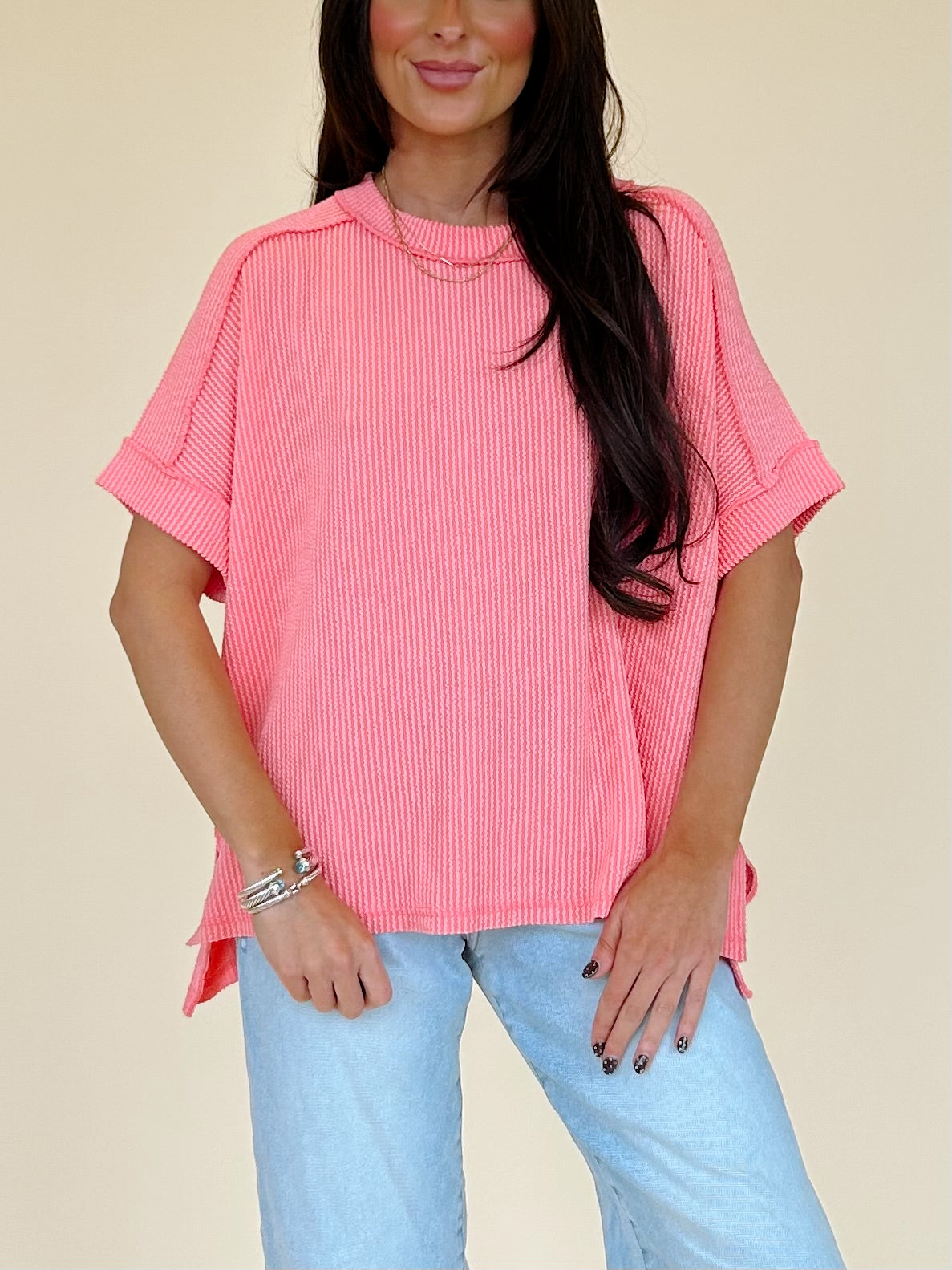 The Sara Top is a Wavy Corded Raised Ribbed Cuff Sleeve Raw Edge Top